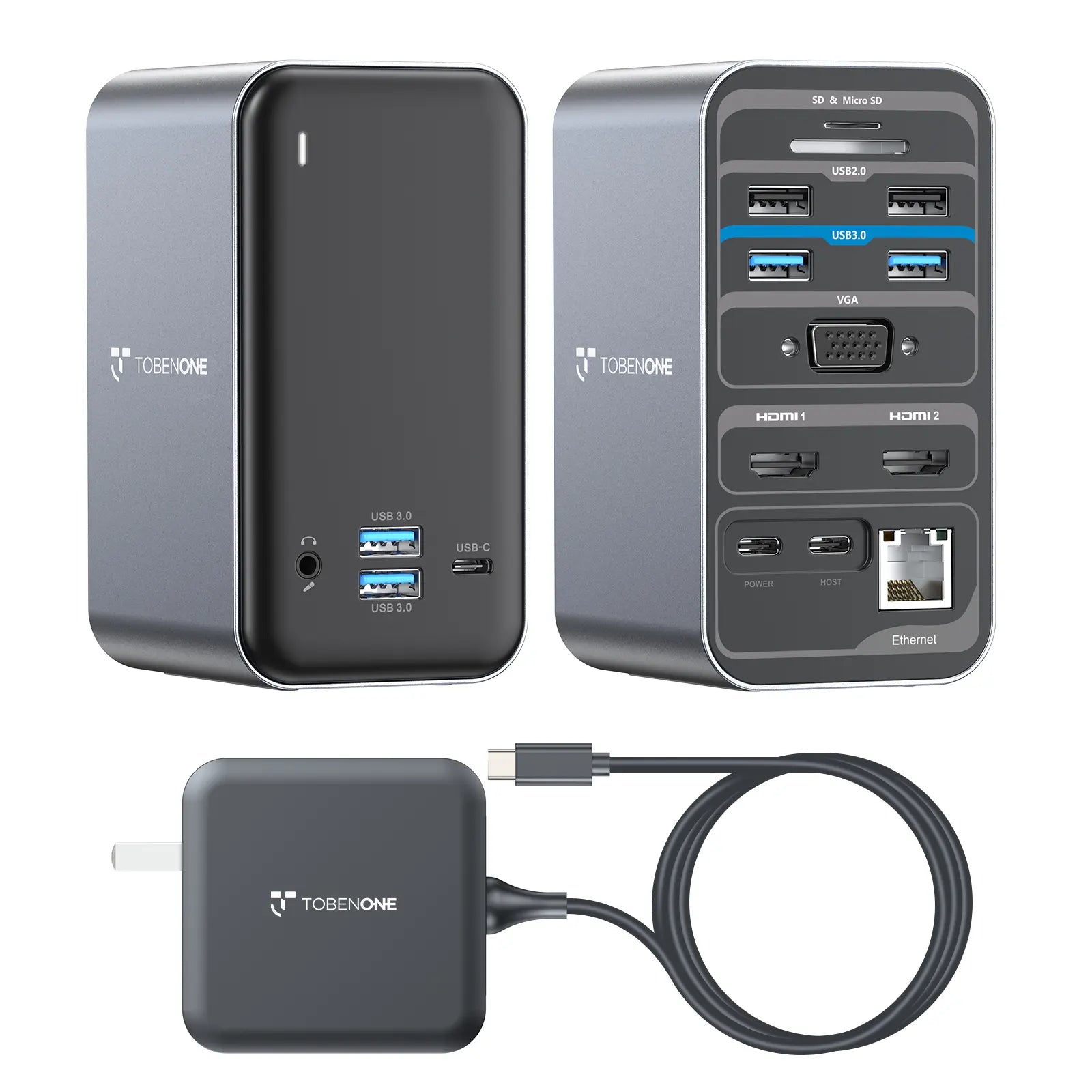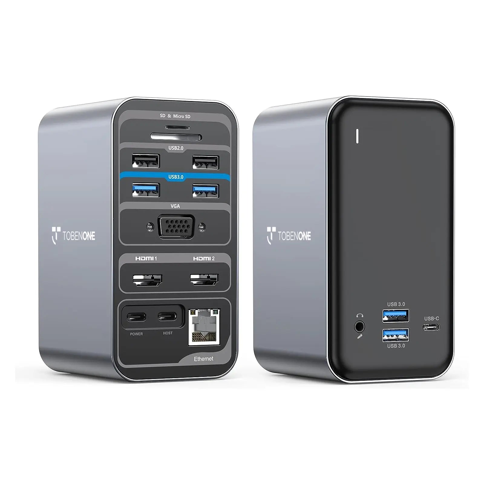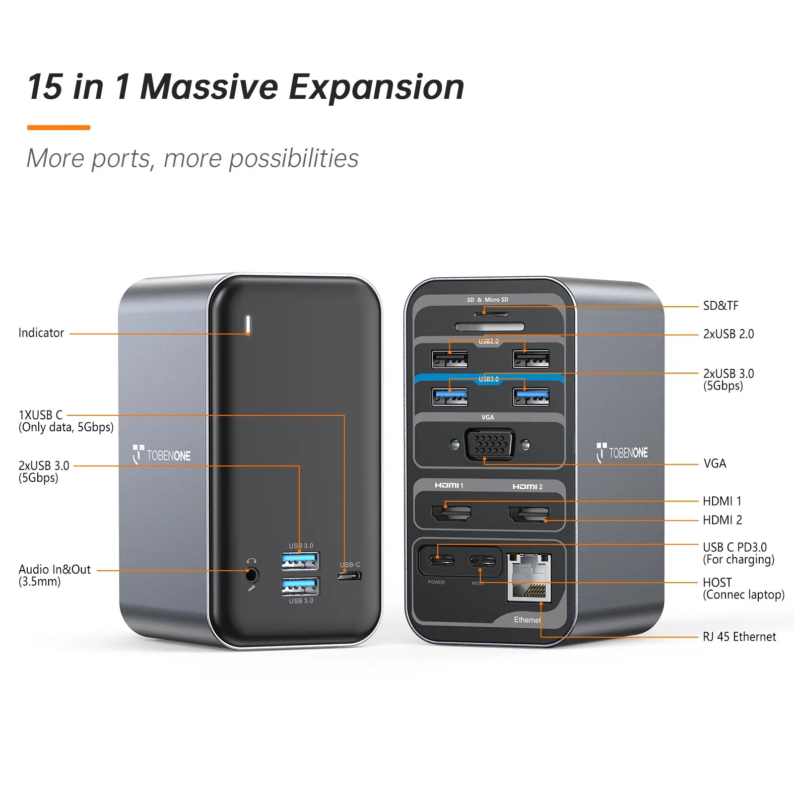 15-in-1 USB C docking station: With this TobenONE USB C docking station dual monitor you can easily extend your Windows laptop from one Type C/Thunderbolt 3/4 port into 15 ports, this dock is equipped with dual HDMI, VGA, 4×USB 3.0, and 1×USB C data transfer ports(5Gpbs), USB C PD 3.0, 2×USB 2.0 for wireless devices such as keyboard or mouse, 3.5mm Audio, SD/TF reader and RJ45 Gigabit Ethernet, which fully meet your needs in daily life.