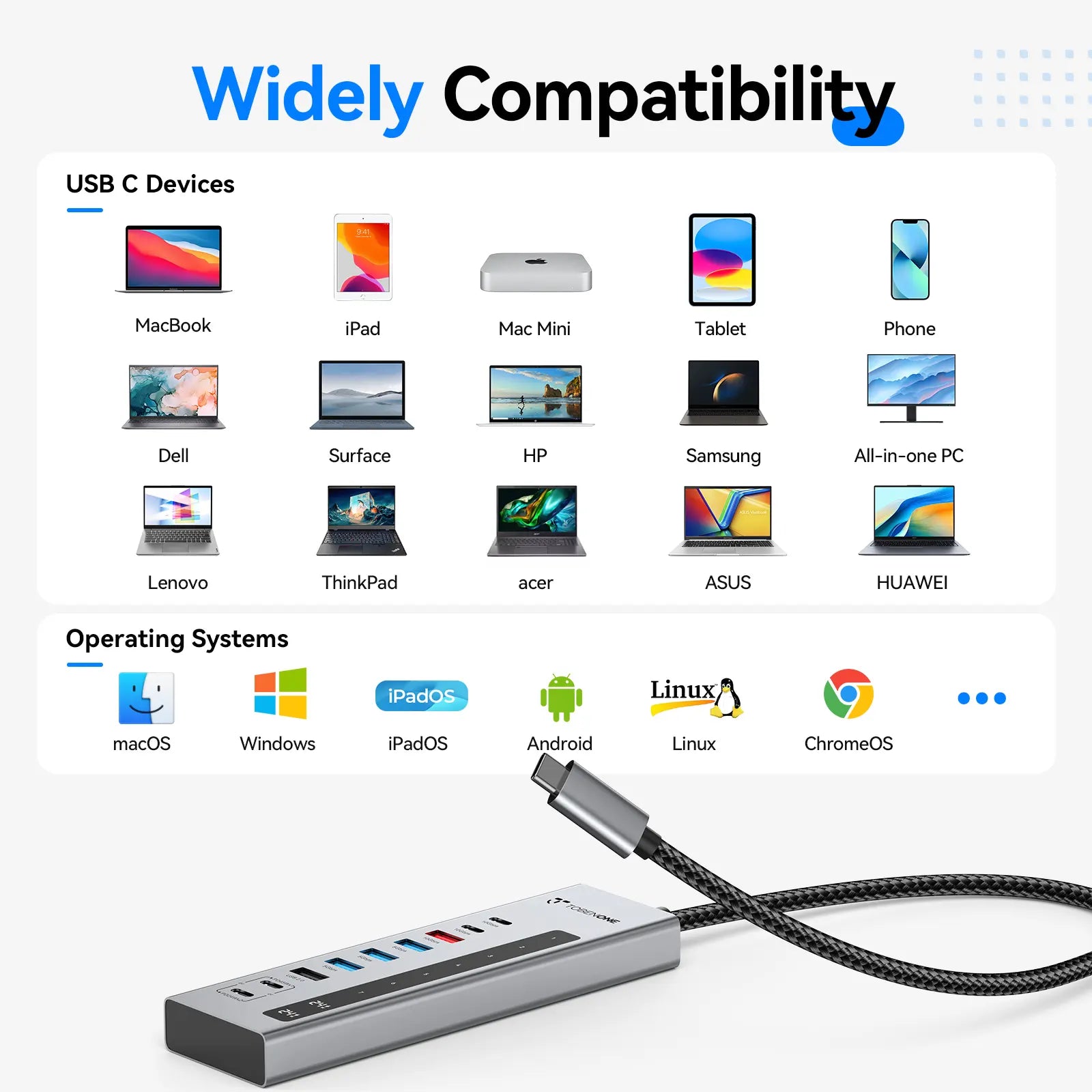 10 Gbps Ultra-Fast Data Powered Hub: Equipped with USB-A 3.1, 2 USB-C 3.1, 3 USB-A 3.0, and 1 USB-A 2.0 ports, this USB C data transfer hub facilitates rapid data speeds up to 10Gbps, ideal for efficient multitasking and handling various tasks swiftly.