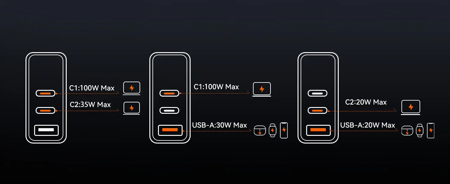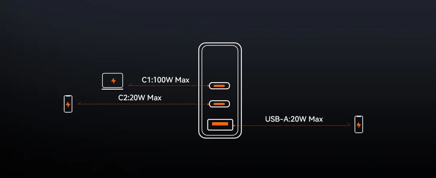 USB-C2: 100W Max, 5V/3A 9V/3A 12V/3A 15V/3A 20V/5A PPS: 3.3-21V/5A; USB-A: 30W Max, 5V/3A 9V/3A 12V/2.5A 20V/1.5A