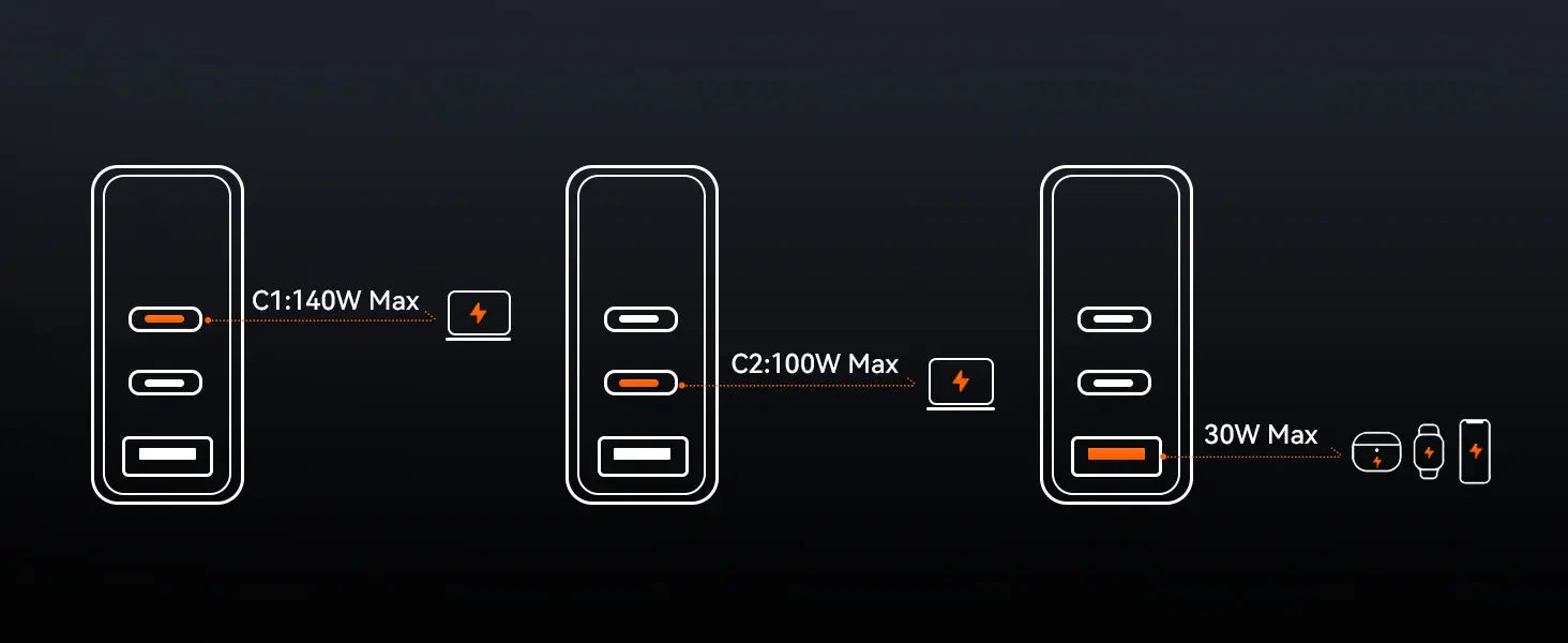 USB-C1: 140W Max, 5V/3A 9V/3A 12V/3A 15V/3A 20V/5A 28V/5A PPS: 3.3-21V/5A;