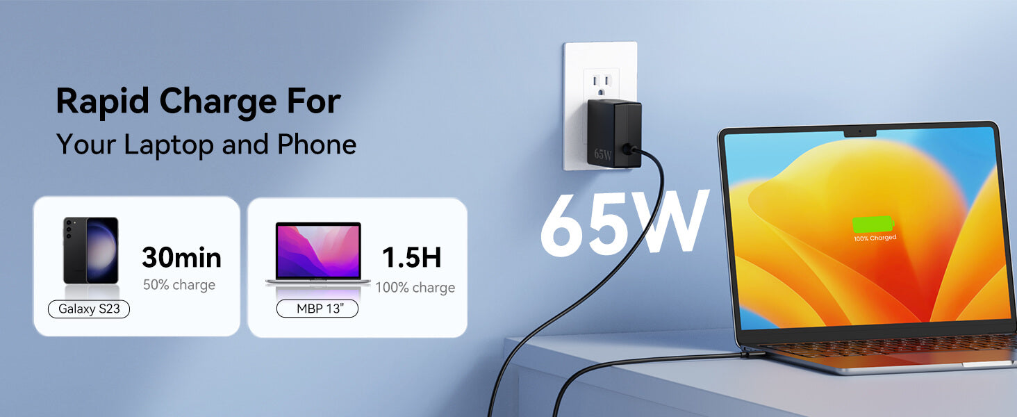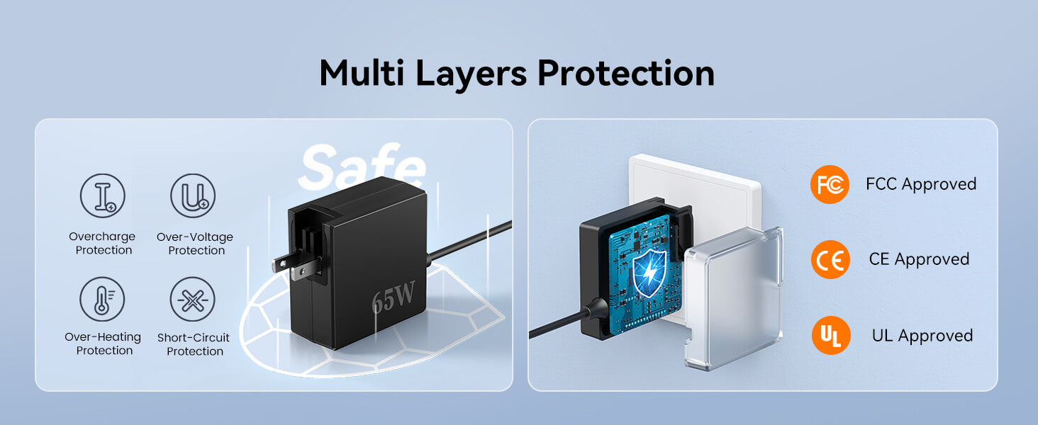 65W Safe & Fast Charging: Our 65W charger charger adapter has multi-protection safety features, including over-current protection, over-voltage protection, over-temperature protection, overload protection, short circuit protection, and leakage protection. Even if the usb c computer charger is charged overnight, it will not overheat and reduce life.