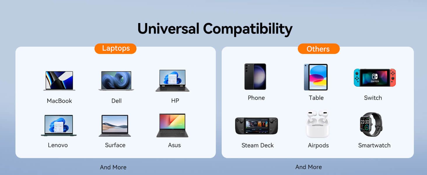 Universal Type C Charger: This 65 watt usb c charger is compatible with MacBook Pro or Air, Dell Latitude, XPS, Lenovo Yoga, Thinkpad, HP Spectre, Samsung Chrome Book, Acer, Smartphones, Nintendo Switch, Steam Deck, Tablets, and other devices with the USB C interface. You only need this universal laptop charger to charge all your usbc devices.