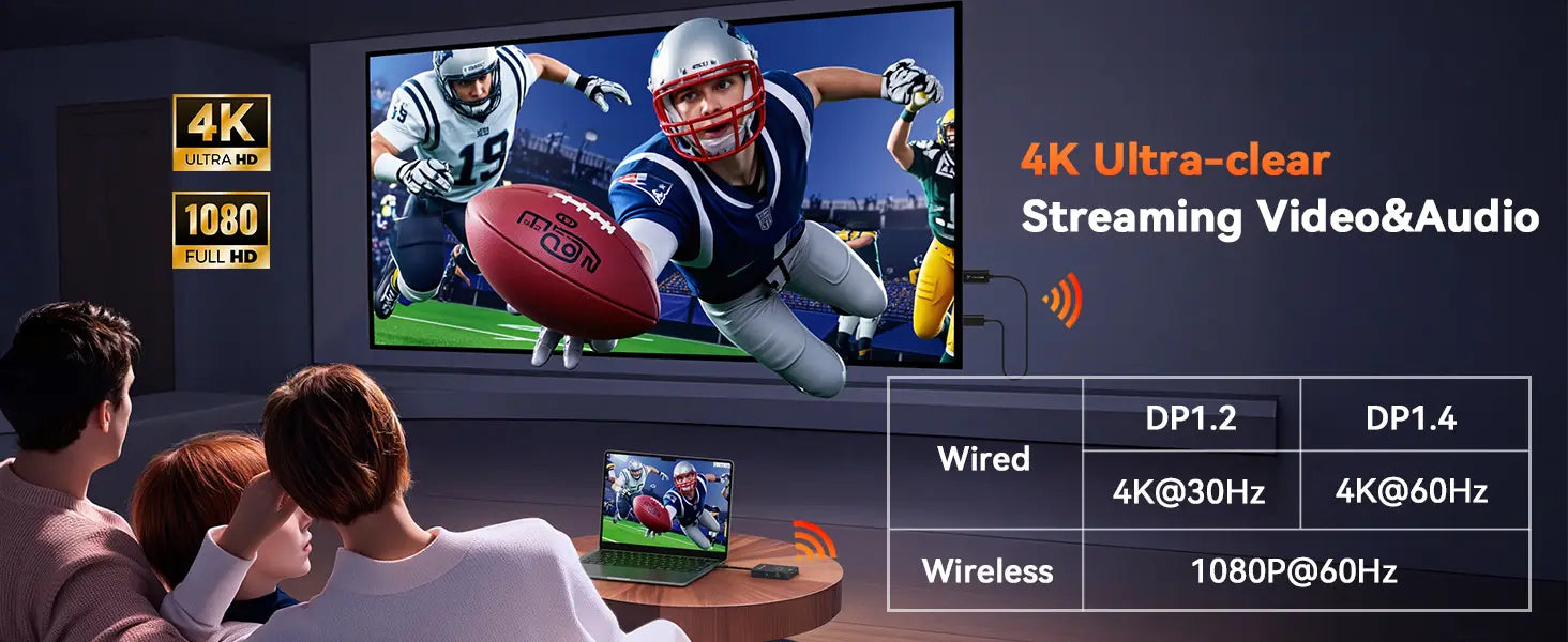 • Wireless and Wired Dual Mode Switch: This wireless HDMI transmitter and receiver experience seamless switching between wireless and wired HDMI output with a single press of the center button. Enjoy 4K@60Hz resolution via HDMI wired and 1080P wirelessly, perfect for your TV or monitor. The wireless HDMI inalambrico connects your devices in just a few seconds, offering ultra-low latency for smoother operation and a clutter-free workspace, all while providing seamless, high-quality streaming.