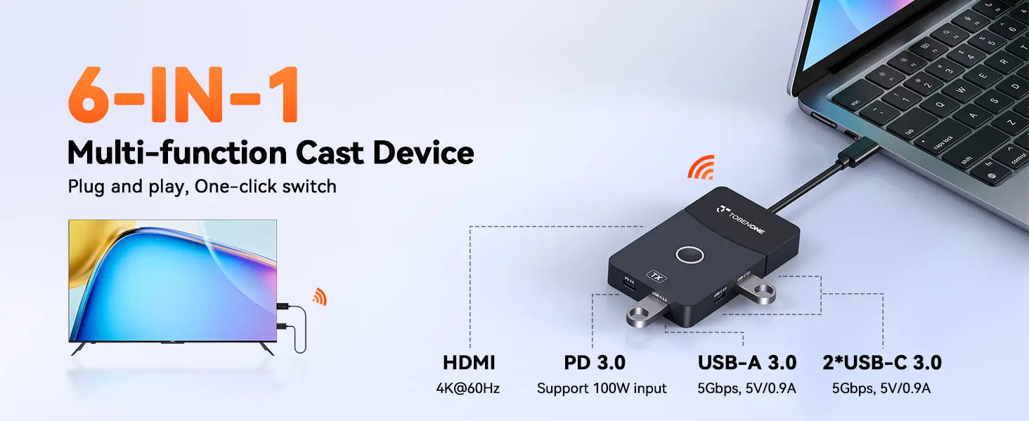 • 6-IN-1 Portable Wireless USB C Hub: The wireless USB C sender features 1 HDMI port, 1 PD 3.0 port (Input 100W, Output 85W), 2 USB-C 3.0 ports, and 1 USB-A 3.0 port. This 4K HDMI wireless transmitter and receiver breaks through the data transmission barriers common to conventional wireless display adapter cast devices. It enables simultaneous data transfer and device charging during display, eliminating the hassle of constantly switching devices for data transfer and truly boosting your productivity.
