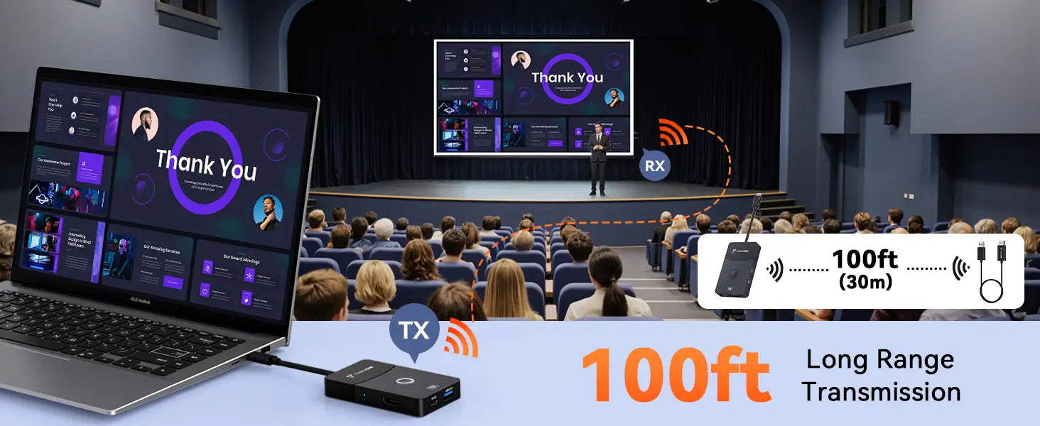 • Long-Distance Stable Transmission: Features 2.4G/5G dual-band chip, with a maximum range of 100 ft (30 meters) unobstructed, this wireless HDMI sender and receiver ensures flexible placement in conference rooms, classrooms, or home theaters. Switch seamlessly between screen mirroring and extended display modes, our wireless HDMI extender all while provides seamless, high-quality video streaming.