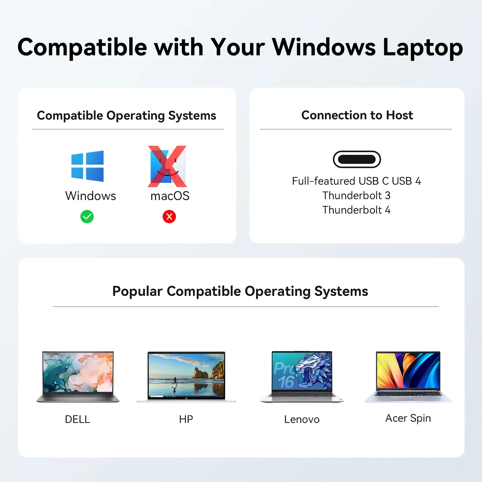 Supports full-featured USB-C, USB4, and Thunderbolt 3 / Thunderbolt 4 systems running Windows 10 / 11 & ChromeOS 100 or newer including, HP ProBook / EliteBook / Spectre x360 series, Dell XPS / Latitude / Inspiron series, Lenovo ThinkPad / IdeaPad / Yoga , Microsoft Surface Pro / Go / Book / Laptop models, LG Gram, Thousands of other laptops which are compliant with full-featured, standards-compliant USB-C ports