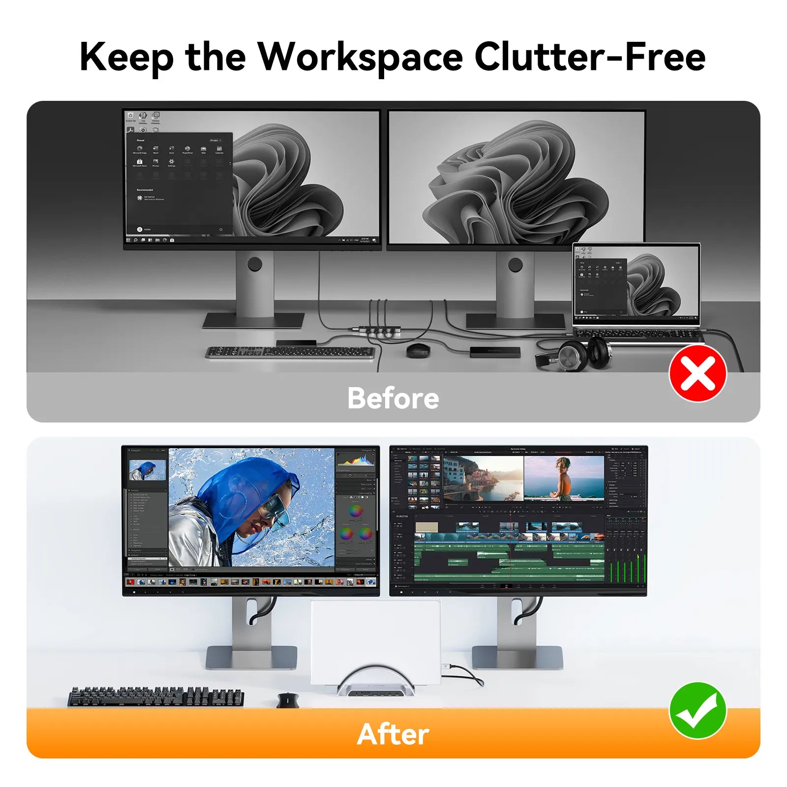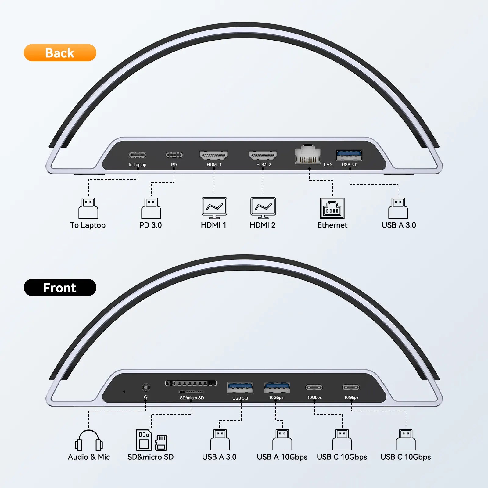 Space-Saving Stand Design: The sleek and compact design of this docking station stand makes it easy to integrate into any workspace. It's efficient layout ensures you have all the ports you need without taking up too much space