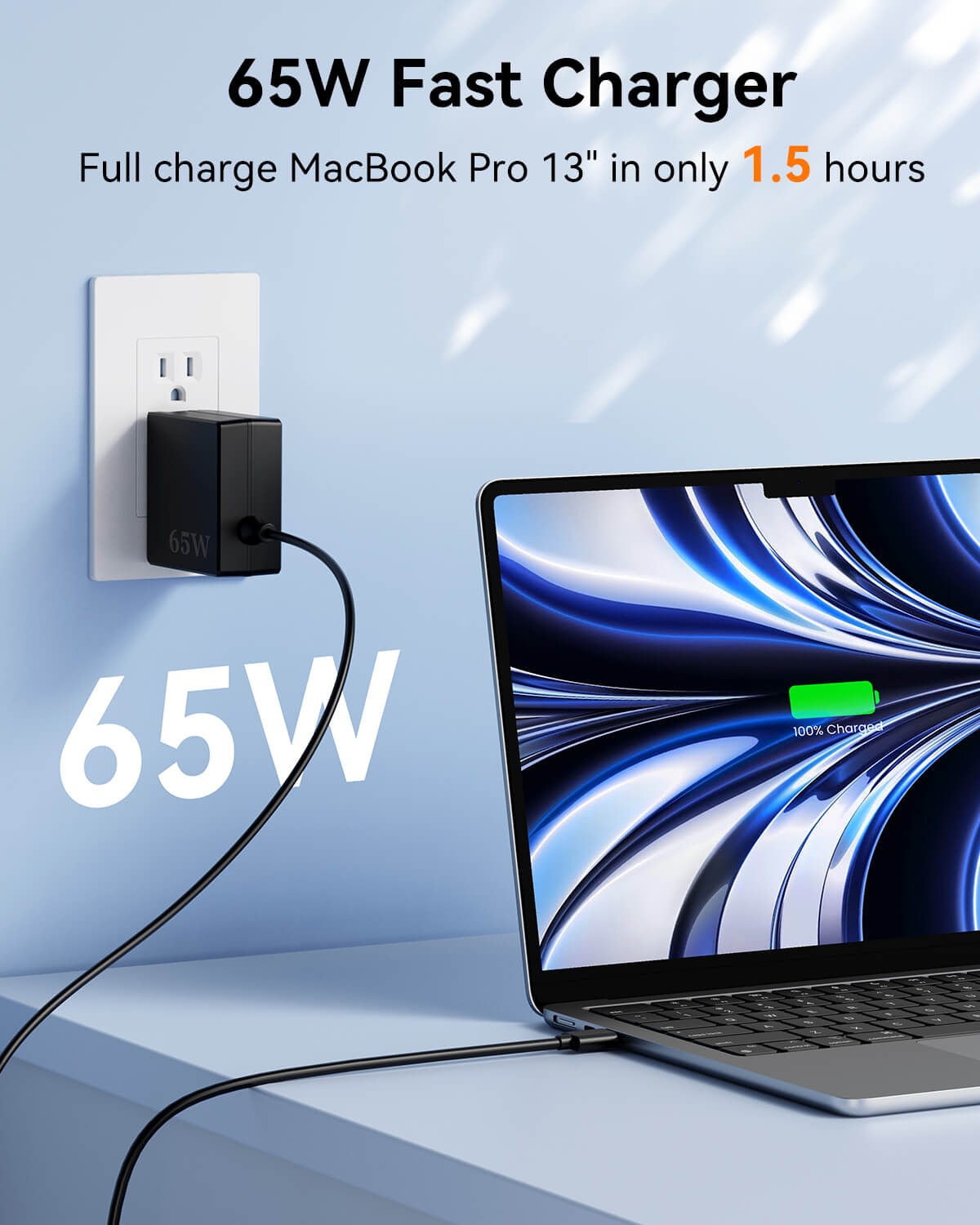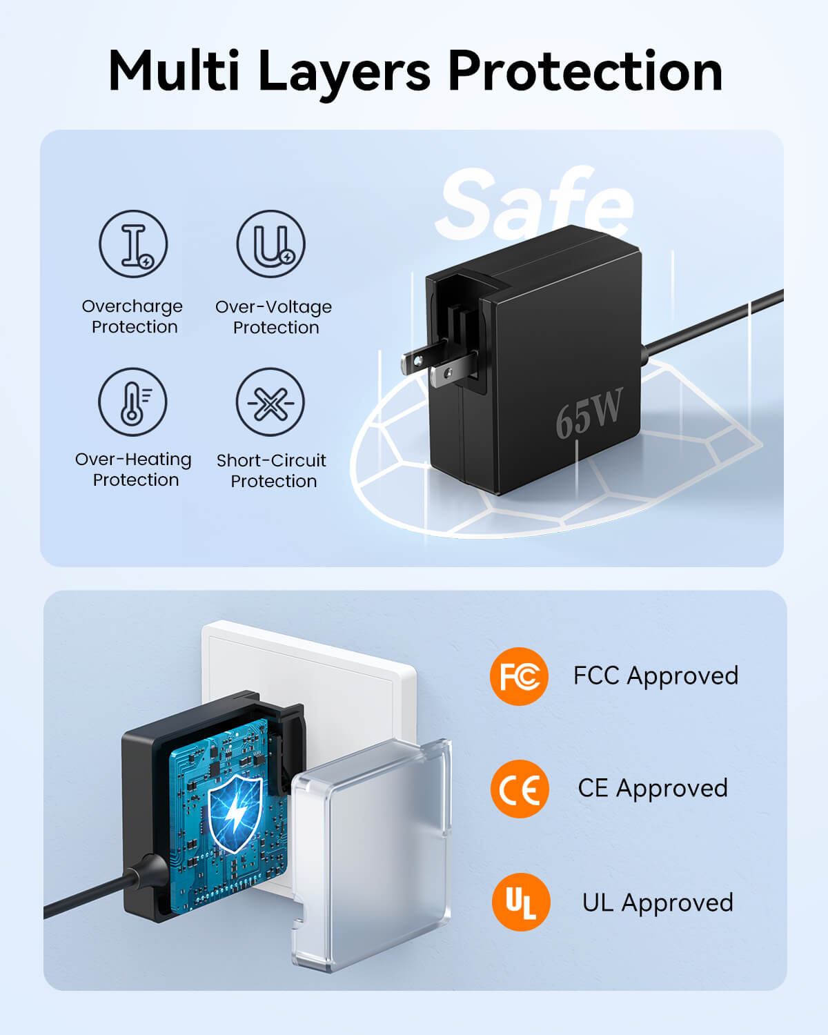 65W Safe & Fast Charging: Our 65W charger charger adapter has multi-protection safety features, including over-current protection, over-voltage protection, over-temperature protection, overload protection, short circuit protection, and leakage protection. Even if the usb c computer charger is charged overnight, it will not overheat and reduce life.