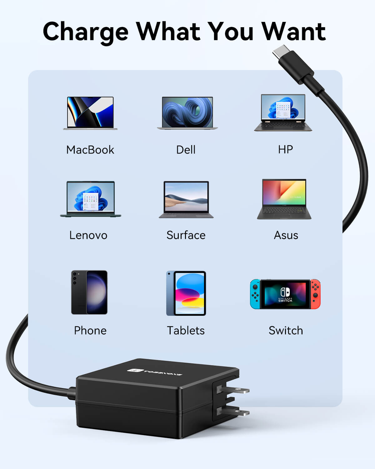 Universal Type C Charger: This 65 watt usb c charger is compatible with MacBook Pro or Air, Dell Latitude, XPS, Lenovo Yoga, Thinkpad, HP Spectre, Samsung Chrome Book, Acer, Smartphones, Nintendo Switch, Steam Deck, Tablets, and other devices with the USB C interface. You only need this universal laptop charger to charge all your usbc devices.