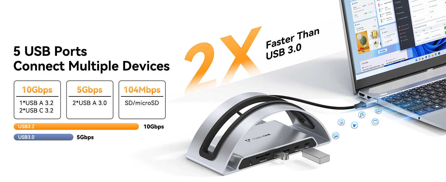 • Super-Fast Data Transfers: Enjoy lightning-fast transfers with 10Gbps speeds on USB C 3.2 and USB A 3.2 ports. Whether you're transferring files or connecting peripherals, this docking station for laptop keeps everything running smoothly