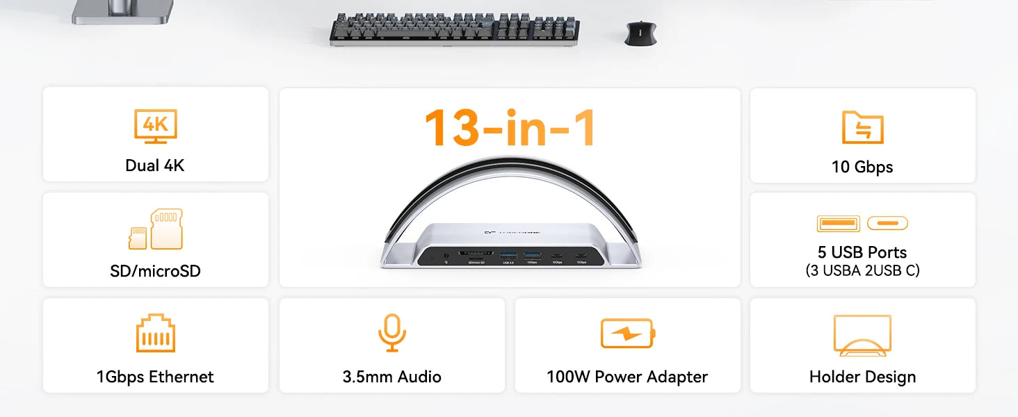 UDS047 TobenONE Laptop Docking Station Dual Monitor, 13-in-1 USB C Docking Station Stand