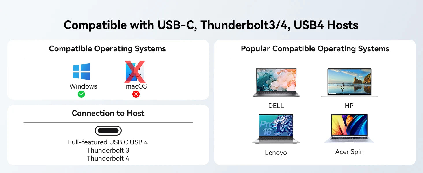 Supports full-featured USB-C, USB4, and Thunderbolt 3 / Thunderbolt 4 systems running Windows 10 / 11 & ChromeOS 100 or newer including, HP ProBook / EliteBook / Spectre x360 series, Dell XPS / Latitude / Inspiron series, Lenovo ThinkPad / IdeaPad / Yoga , Microsoft Surface Pro / Go / Book / Laptop models, LG Gram, Thousands of other laptops which are compliant with full-featured, standards-compliant USB-C ports