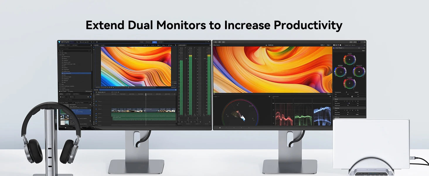 • Dual 4K Monitors: Laptop docking station dual monitor expand your view with 2 HDMI ports that support 4K@60Hz, allowing you to connect two monitors. You can multitask like a pro, working on multiple projects simultaneously or having your favorite shows on one screen while you work on the other. It's perfect for both work and entertainment, making your digital life more immersive