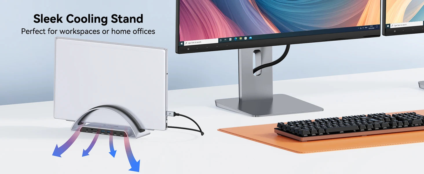 • Space-Saving Stand Design: The sleek and compact design of this docking station stand makes it easy to integrate into any workspace. It's efficient layout ensures you have all the ports you need without taking up too much space