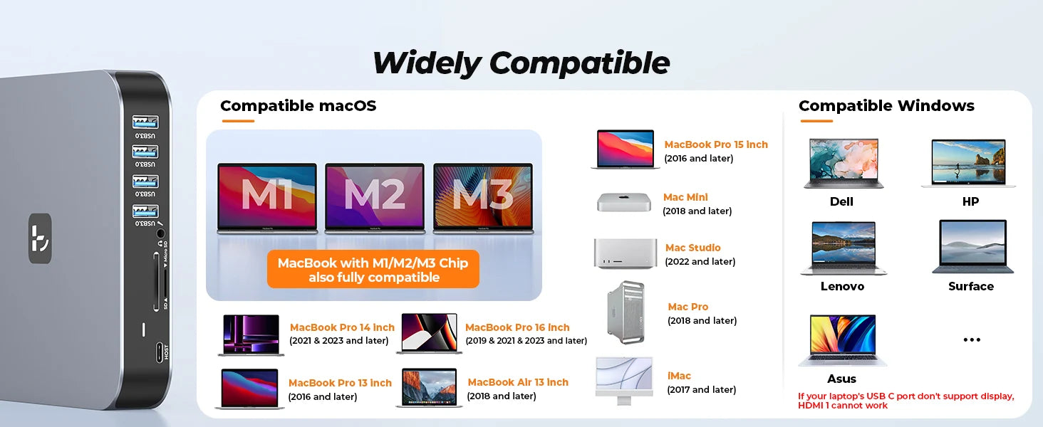 Widely Compatible with macOS & Windows: This USB C docking station with power is compatible with Windows or macOS which equip with a full-featured Type C port or thunderbolt 3/4 port. Such as MacBook Pro/Air 2016-2023; Dell Latitude 5480, Dell XPS 15, HP Elitebook 800 G4, Lenovo Yoga 910, Surface Pro 7, etc. If your laptop only supports data transfer and power supply, you can only extend the dual monitor via HDMI 2 and VGA.