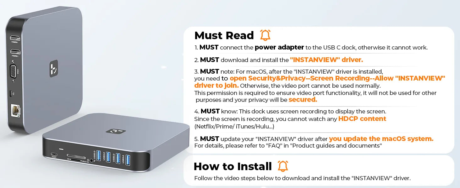 3> Please make sure you have installed and initiated InstantView to display. (When using the dock to extend dual or triple display for your macOS laptop, the app will require a screen recording permission to capture pixels and send them to your external monitors: Apple Menu-->System Preference--> Security&Privacy->select "Privacy" tab->Scoll to find" Screen Recording" and check "macOS InstantView")
