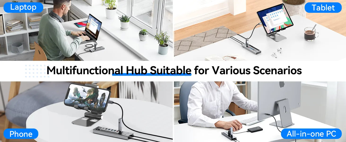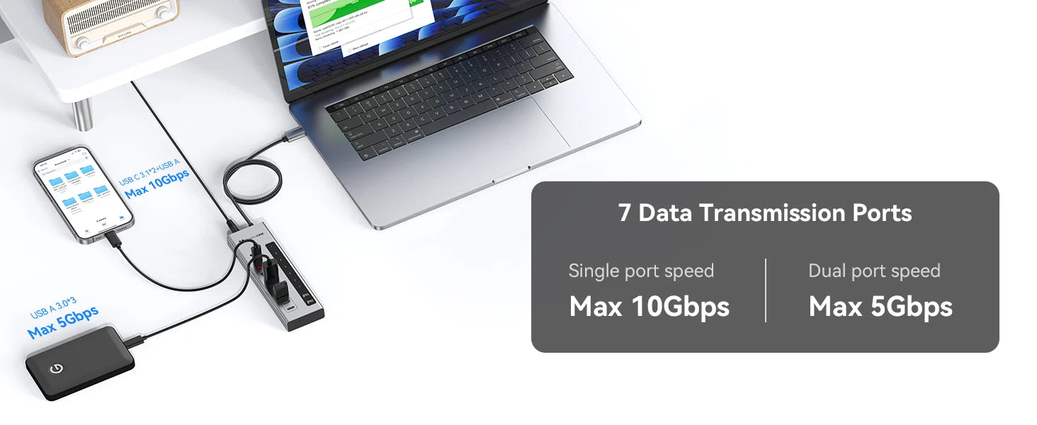 • 10 Gbps Ultra-Fast Data Powered Hub: Equipped with USB-A 3.1, 2 USB-C 3.1, 3 USB-A 3.0, and 1 USB-A 2.0 ports, this USB C data transfer hub facilitates rapid data speeds up to 10Gbps, ideal for efficient multitasking and handling various tasks swiftly.