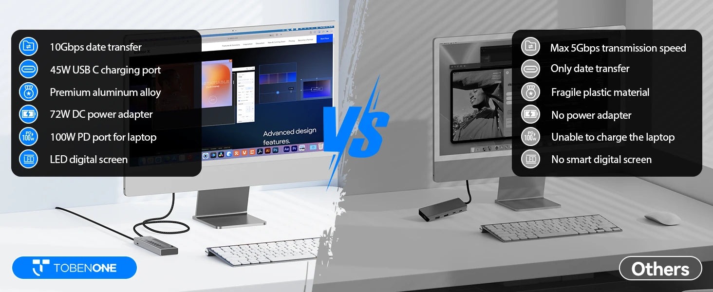• 11-in-1 Multi-function USB C Hub: TobenONE USB C powered hub boasts 3 USB 3.1 data ports (up to 10Gbps), 4 USB 3.0 (max 5Gbps), 2 USB C charging ports (max 45W), a 72W DC port, and a 100W USB-C PD port, catering to a wide range of your needs and enhancing your productivity.