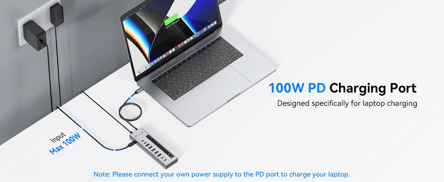 • 100W USB-C PD-IN Port: This USB C Splitter adds a USB C PD charging port specifically for laptop charging, breaking the limitation that the hub can't be charged without a laptop, and accepts 100W power input and outputs with no pre-fastened power.
