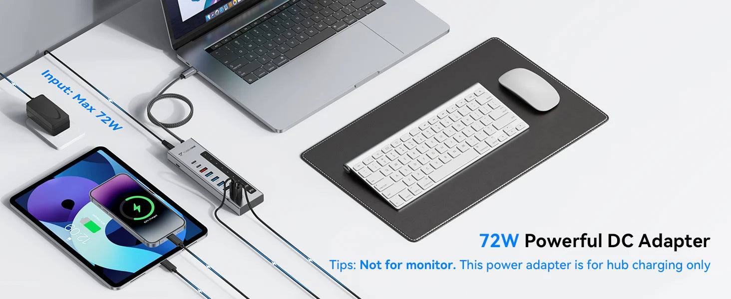 • Equipped with a 72W DC Power Adapter: Our USB-C multiport hub kit comes with a 72W power adapter. Please note that be sure to connect this power supply to the hub before use, hub charging before transferring and device charging tasks.