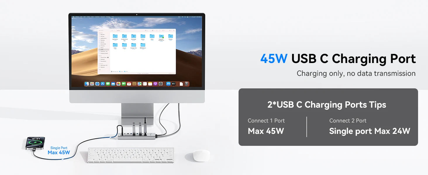 • 45W USB C Charging Ports: TobenONE powered USB-C hub includes 2 USB C ports for charging multiple devices. Please note: Maximum power of 45W is achievable when using one port; if both are used simultaneously, each port provides about 24W.