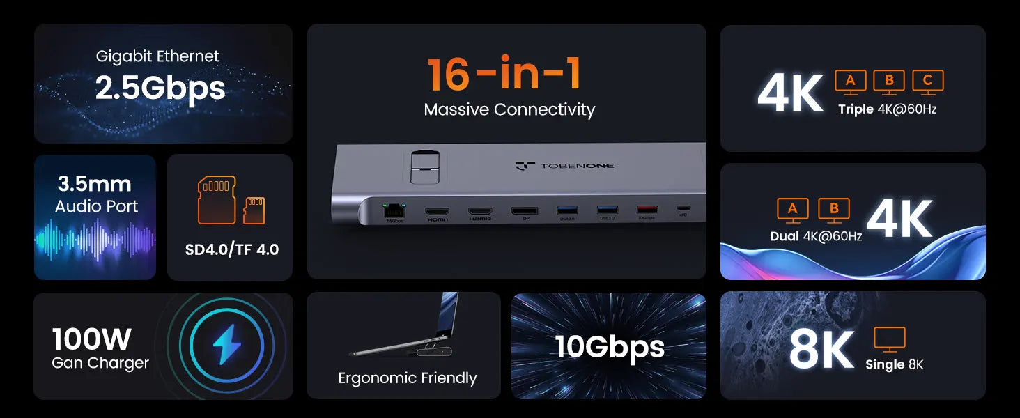 • Unlock Maximum Efficiency with Our 16-in-1 USB C docking station triple monitor: Transform your laptop's single USB-C port into a versatile hub with 16 ports using just one cable. Laptop docking station 3 monitors includes dual HDMI and a DisplayPort for up to 4K@60Hz, 10Gbps USB-A and USB-C for high-speed data transfer, dedicated USB ports for wireless devices, a 2.5Gbps Ethernet port for rapid internet access, SD and TF card slots, and a PD3.0 port. This all-in-one solution maximizes connectivity and productivity effortlessly.