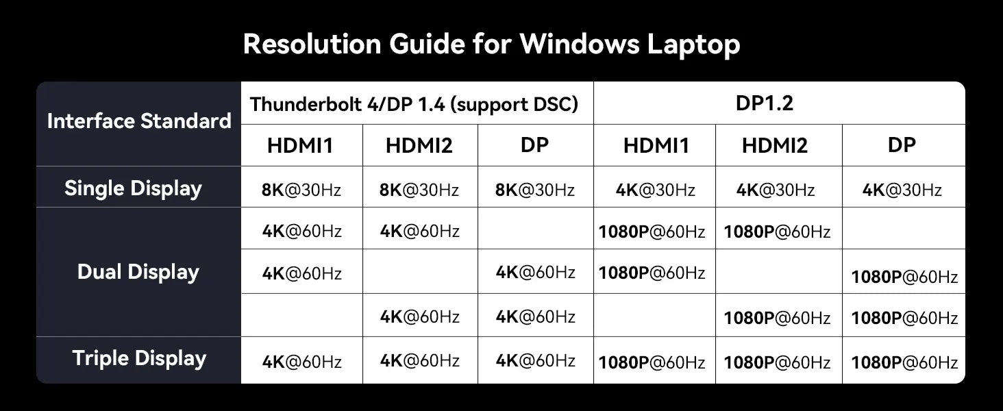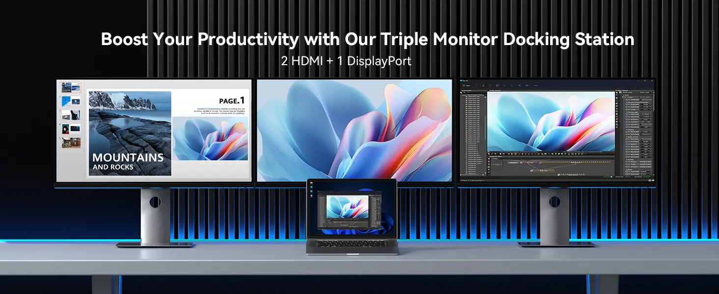• Experience Superior Visual Clarity with Our Advanced USB C docking station dual monitor:This docking station with 2 hdmi ports offers exceptional 4K@60Hz resolution for dual or triple monitor setups, and even supports a single 8K@30Hz display, providing significantly clearer visuals than standard 1080P. Display port docking station enhanced sharpness ensures every detail is crisply rendered, making it perfect for high-definition tasks and immersive multimedia experiences.Resolution depends on the laptop and monitor.