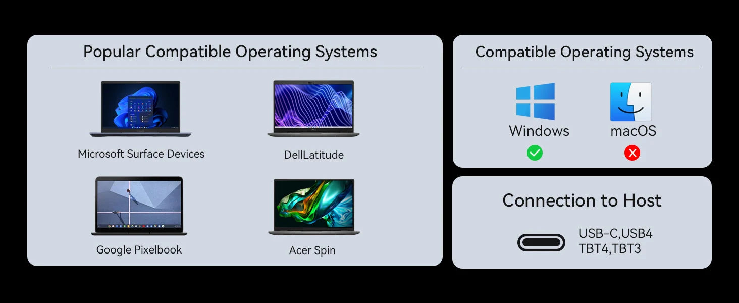 • Extraordinary Compatibility: This laptop stand docking station supports triple/dual display functionality and is compatible with Windows 10+ and Chromebook systems that support USB-C Display Port Alternate Mode, Thunderbolt 4 / 3, USB4. Docking station for hp laptop works seamlessly with models like the HP ProBook / EliteBook / Spectre x360 series, Dell XPS / Latitude / Inspiron series. This compatibility ensures that you can maximize your productivity by extending or mirroring content across multiple displays effortlessly. Not recommended for Mac.