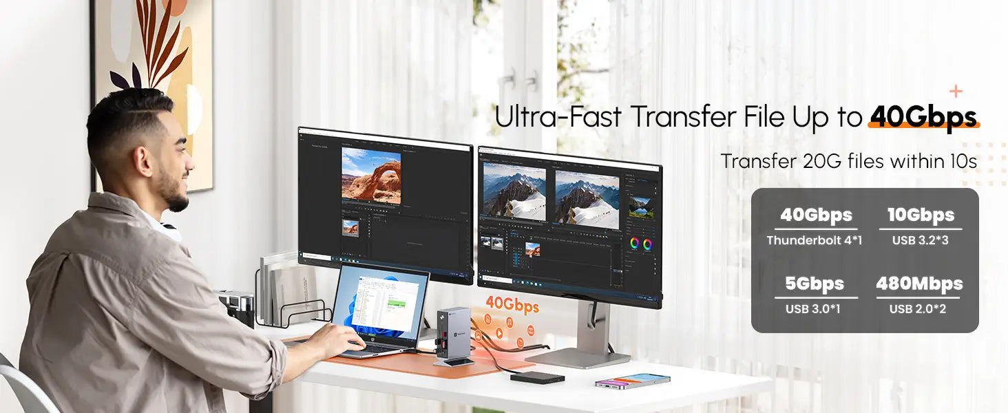 • Super-speed Data Transfer Docking Station: Connect to the 1 USB C 3.2 & 2 USB A 3.2 ports of the Thunderbolt 4 to HDMI docking station offering a data transfer speed going up to 10Gbps for tablets, flash drives, and any compatible external storage, the time required to transfer a 20G file just needs about 16.4s! Coupled with the 40 Gbps Thunderbolt 4 port, you can transfer data between devices at faster speeds. Only takes 10 seconds to transfer a 20G file, perfect for drives and HDD devices.