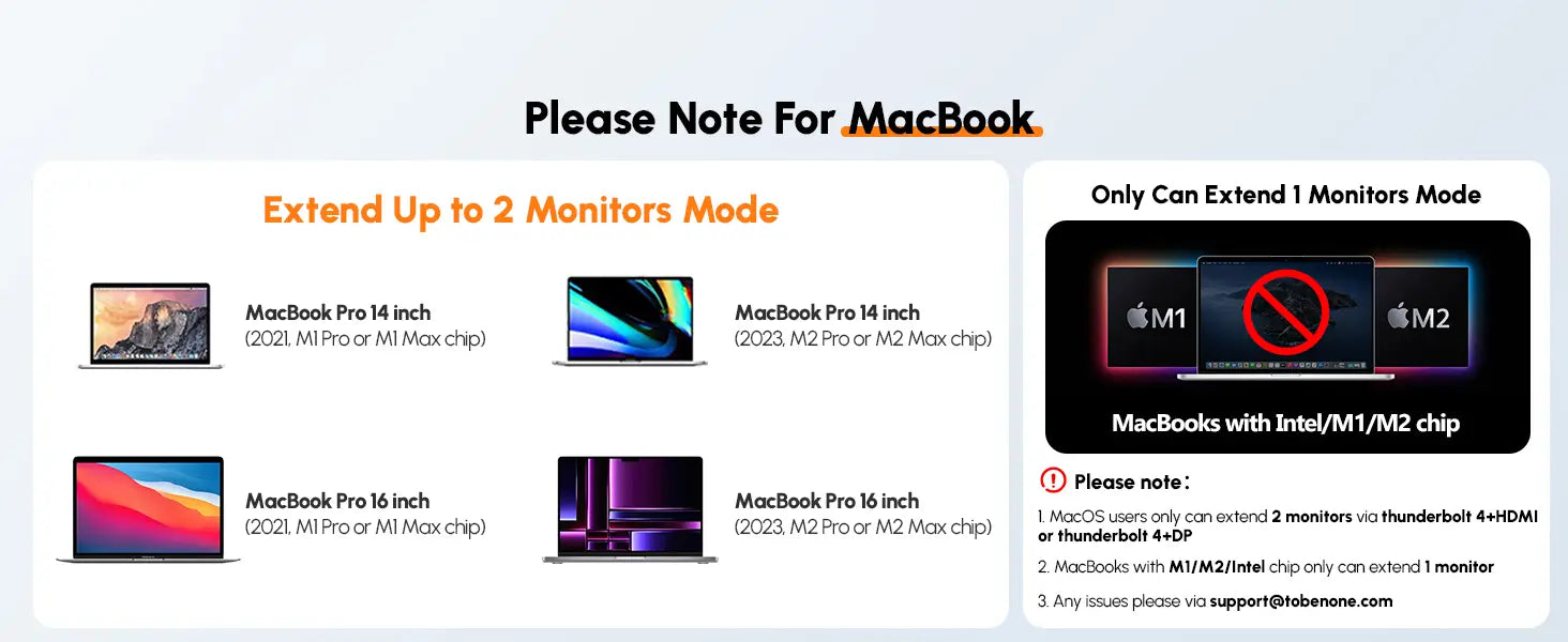 3. MacBooks with M1/M2/M3/Intel chip only can extend 1 monitor