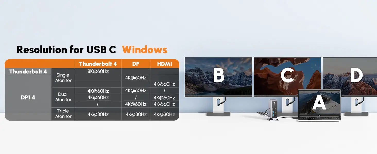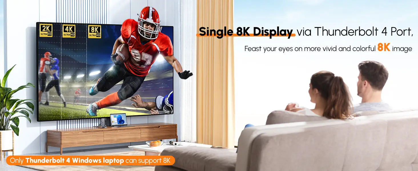 • Single 8K Display for Thunderbolt 4 Windows Laptop: Thunderbolt 4 Windows laptop users can extend a single 8K display via the Thunderbolt 4 port of the USB C Thunderbolt 4 docking station, providing more pixels for sharper, more attractive, and lag-free picture quality, ideal for sporting events or medical conferences.
