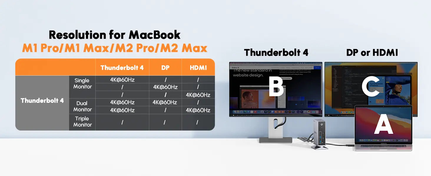 2. MacOS users only can extend 2 monitors via thunderbolt 4+HDMI or thunderbolt 4+DP