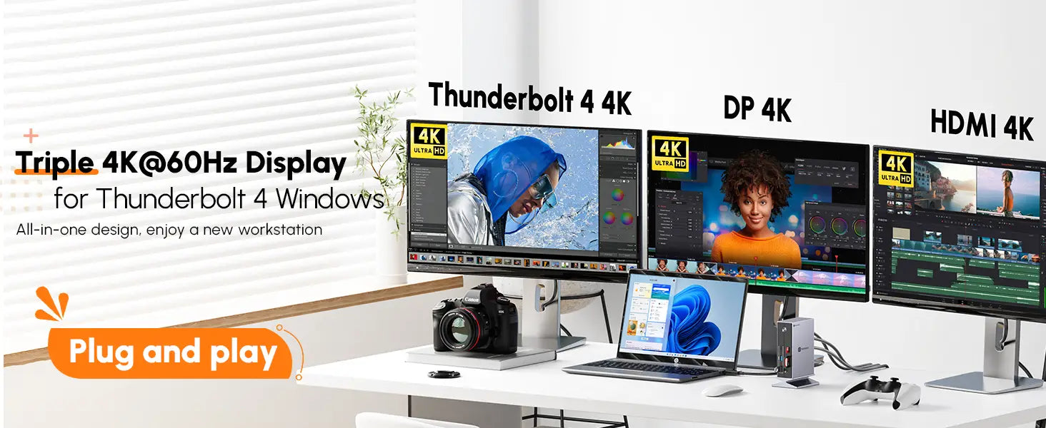 The UDS035 docking station can extend multiple displays for Windows with Thunderbolt 4/3/USB 4 or a full-feature USB C port, such as Dell XPS 13, HP, Lenovo, and MacBook Pro with M1 Pro/M1 Max/M2 Pro/M2 Max/M3 Pro/M3 Max, etc. The Thunderbolt 4 docking station triple monitor is plug-and-play and requires no extra drivers, perfect for work-from-home or office environments utilizing both Windows and macOS.