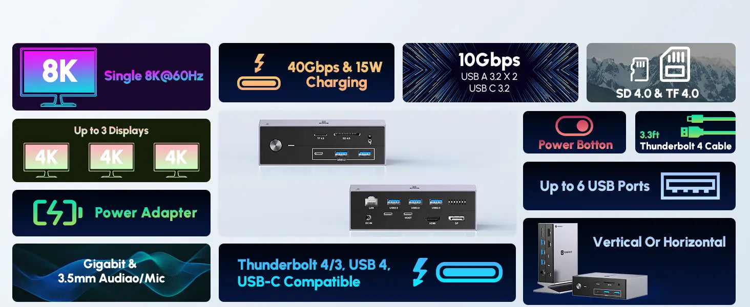 TobenONE UDS035 Thunderbolt 4 Docking Station 8K or Triple 4K@60Hz Display for Thunderbolt 3/4/USB C Windows, MacBook Pro