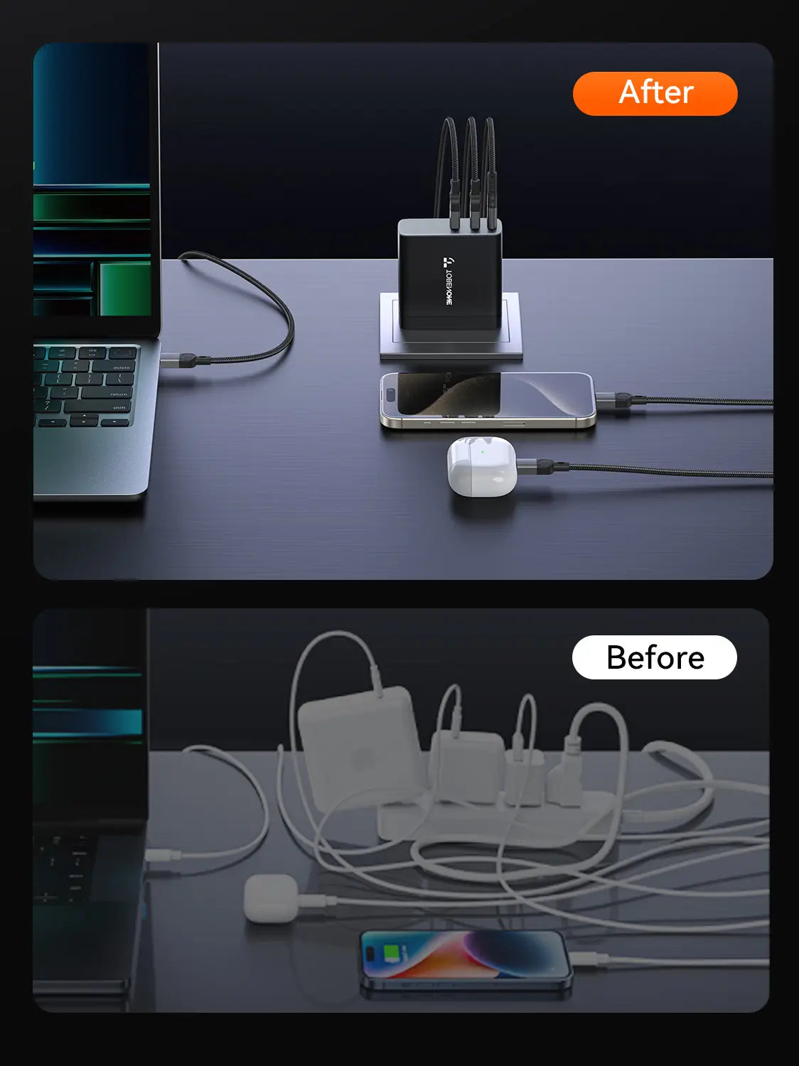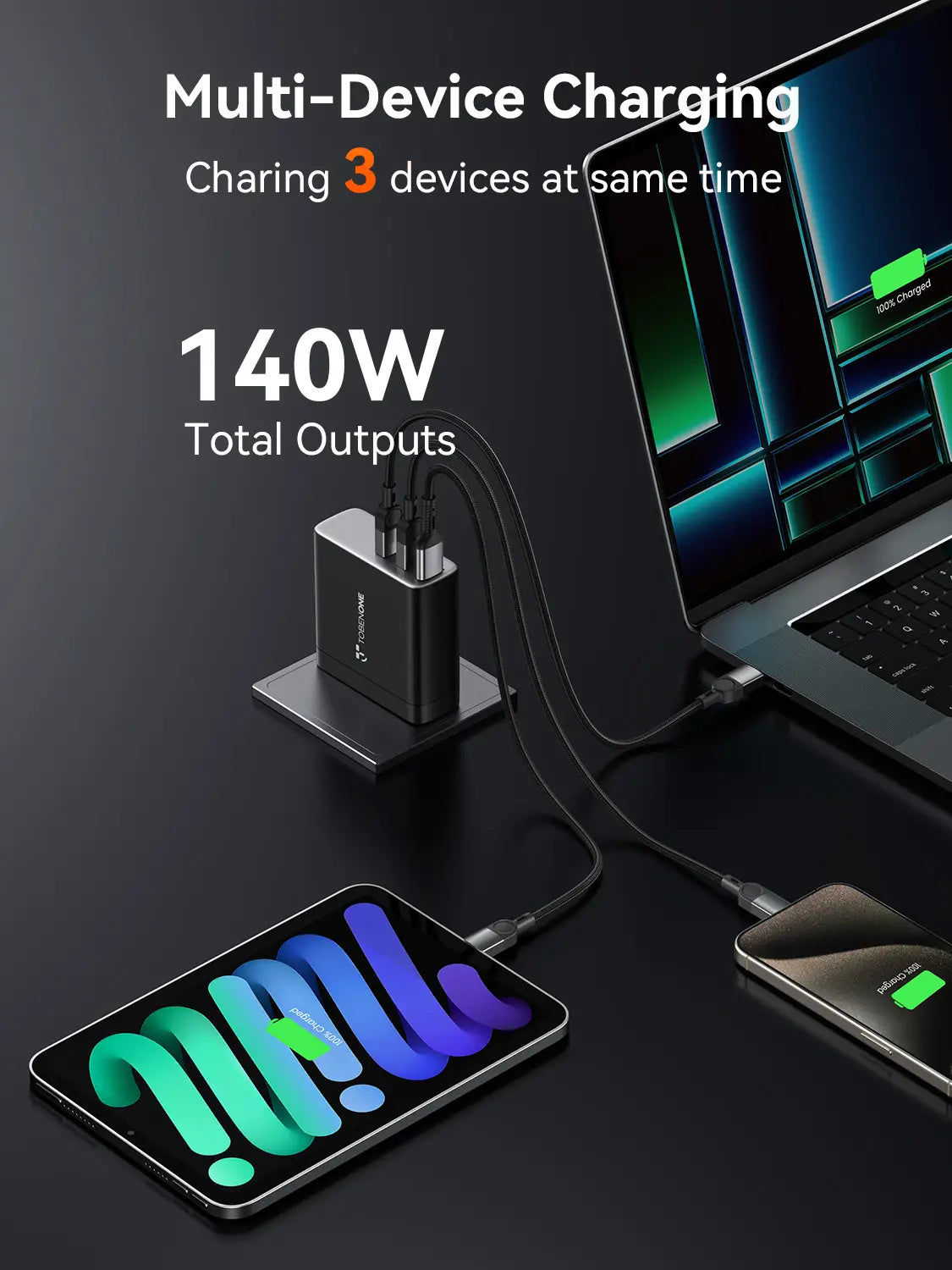 • 3 in 1 Multiport Charging: This USB C multiport charger supplies the optimized power output to power different devices at maximum speed. Equipped with two USB-C ports and one USB-A port, our USB C wall charger effortlessly powers a 16" laptop, iPad, and phone simultaneously, catering perfectly to multi-device users. With a robust 140W capacity, this adapter not only streamlines your desktop but also eliminates cable clutter for a sleek workspace.