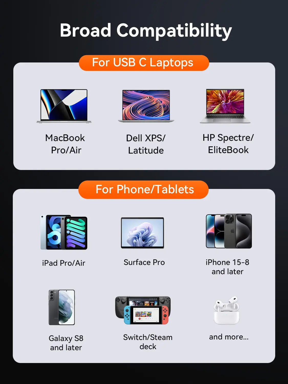 Other: Compatible with Switch Host, Switch Dock, DJI Mavic 3 / Air 2S, AirPods, Apple Watch, Steam Deck, etc.