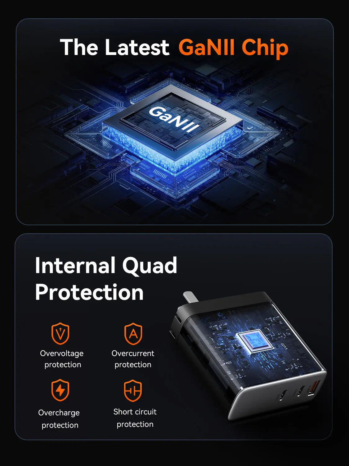 • Upgraded GaN III Technology: This USB C charger adopts upgraded Gallium Nitride (GaN) III generation chip technology, with higher energy efficiency, upgraded heat dissipation, and more stable performance. What's more, this USB C fast charger block has built-in intelligent shunt technology that can automatically adjust the output power according to the needs of different devices, ensuring that each device can get the best charging speed and safety.