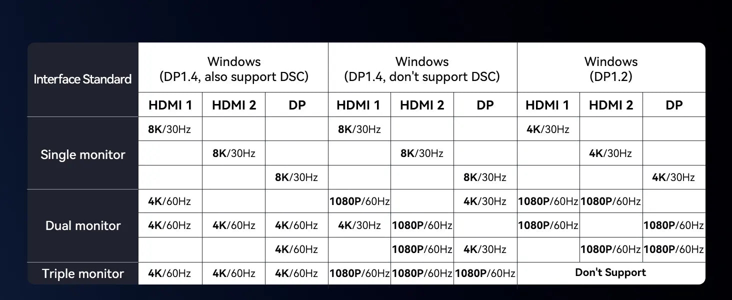 • Triple /Dual 4K Monitor Support: This USB C laptop docking stations stand allows for connecting up to three external monitors simultaneously. Dual HDMI ports and one DisplayPort offer flexible configuration for different monitor setups. Single monitor max up to 8K@30Hz or 4K@144Hz, Dual/Triple monitor max up to 4K@60Hz(DP1.4 and DSC source). Ideal for multitasking(movies, spreadsheets, coding, writing, etc), presentations, and improving productivity with extended multi-displays."