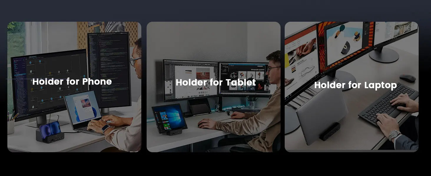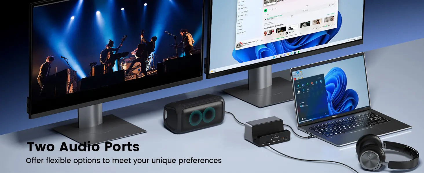 • All-in-One Solution: UDS040W is a powerful and multifunctional docking station. Designed with the needs of office professionals and remote workers in mind, this dock feature multi-ports including 2 HDMI, DP, 8 USB C/A, 2.5G Enternet, SD/TF 4.0, HOST, DC and 2 audio ports. In addition to acting as a device with many ports, there is a slot as a holder. You can plug in a variety of devices into dock and put your laptop/tablet/phone on the slot so that your workspace is more organized and efficient.