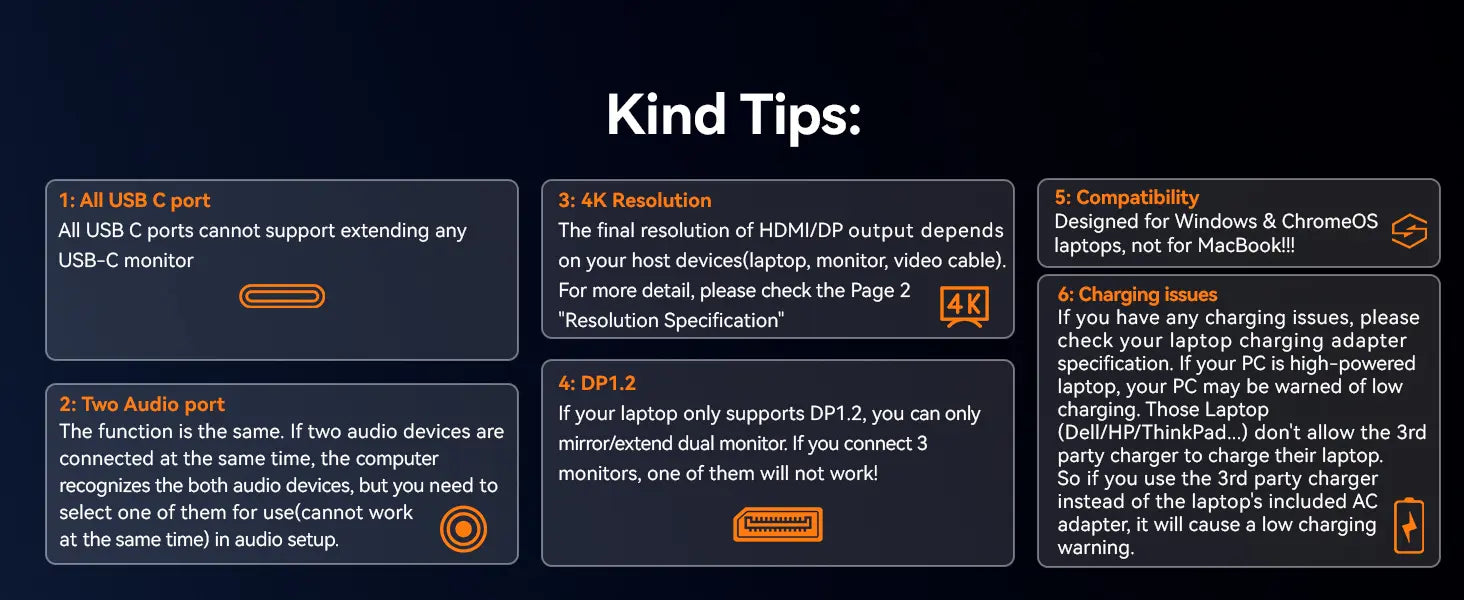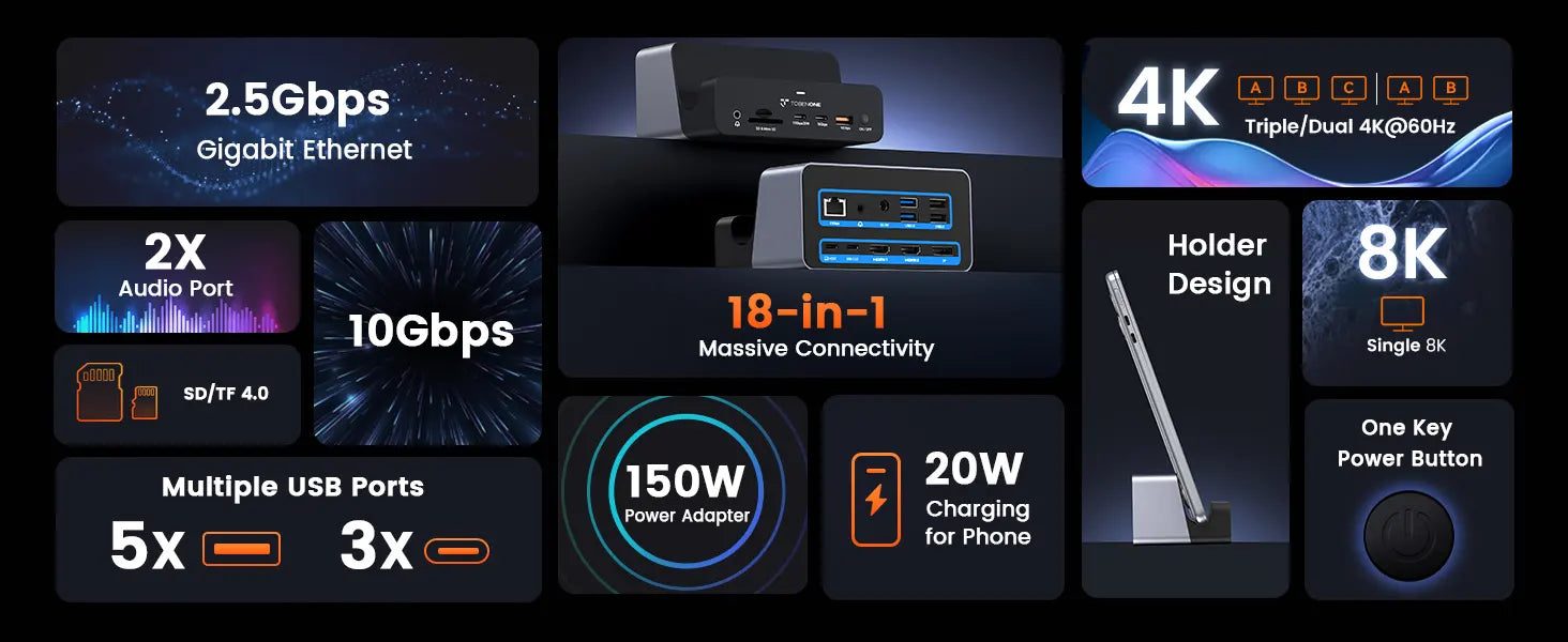 • 150W Power Supply Included: More docks only go with 65W power supply which isn't enough to charge laptop. This dock has a 150W power adapter, it will offer up to 100W of charging power for your laptop, which is more than enough to keep it powered during heavy use, never have to worry about battery life, even during intensive tasks. It also provides up to 20W charge your phone or tablet via the front USB C port. This is a game-changer for those who need to keep devices charged and ready to go.
