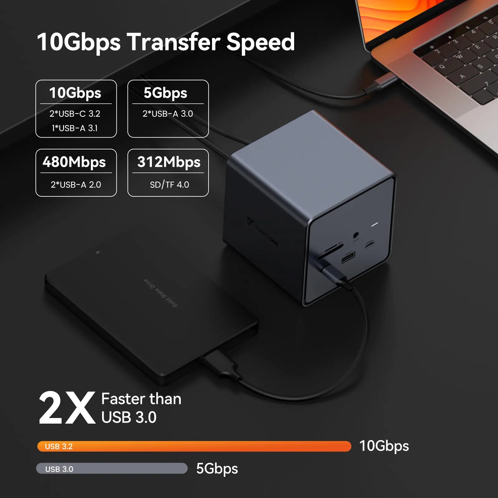 10 Gbps Fast Data Transfer Docking Station: Connect to the 2 × USB C 3.1 and 1 USB A 3.1 port of the docking station dual monitor offering a data transfer speed going up to 10Gbps for tablets, flash drives, and any compatible external storage, the time required to transfer a 20G file just needs about 16.4s! (*Note: USB C ports only support data transfer, NOT for Display).