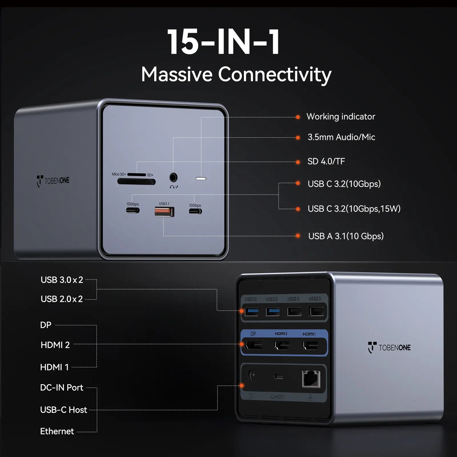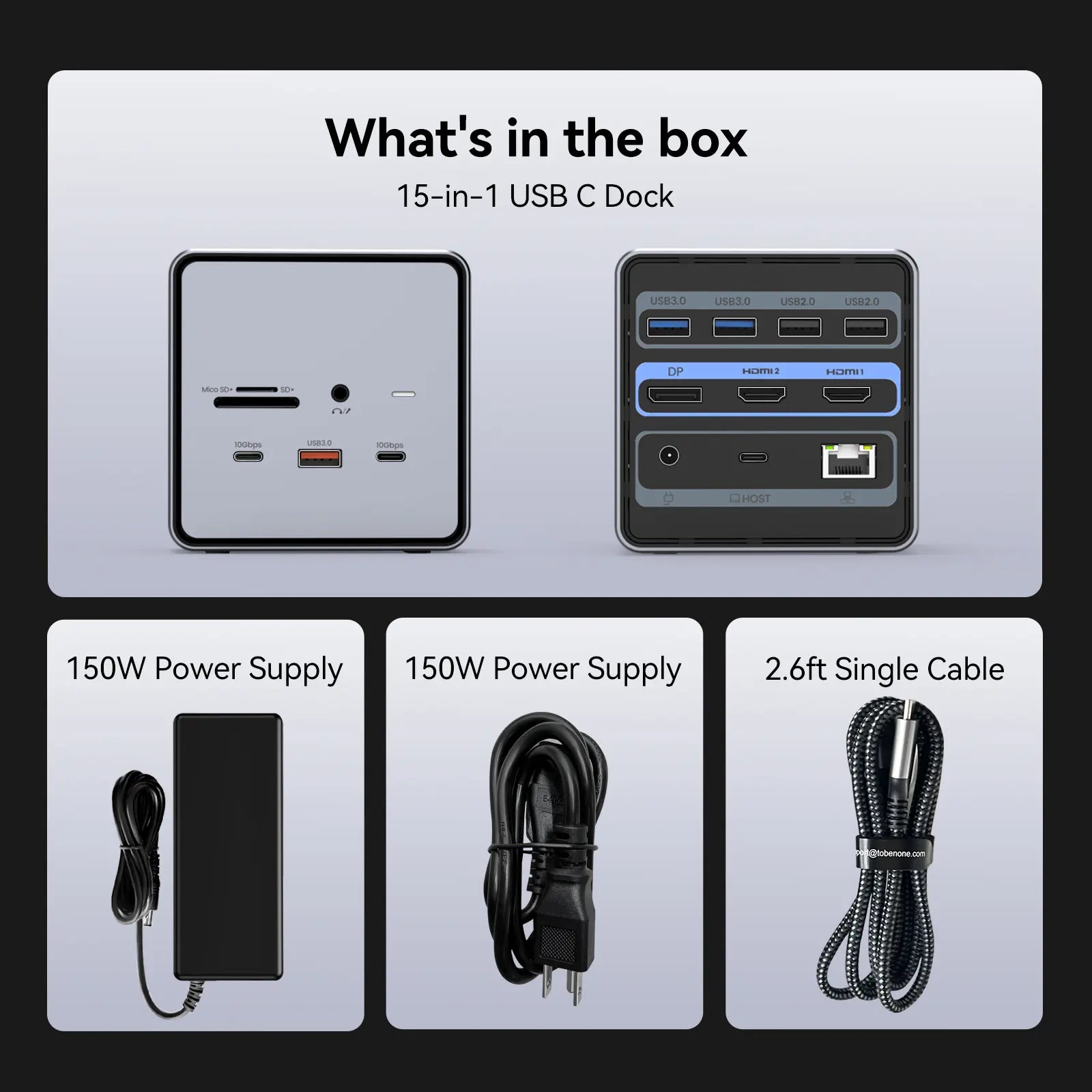 15 In 1 TobenONE USB C Docking Station Dual Monitor Dock with 150W Power Adapter UDS032