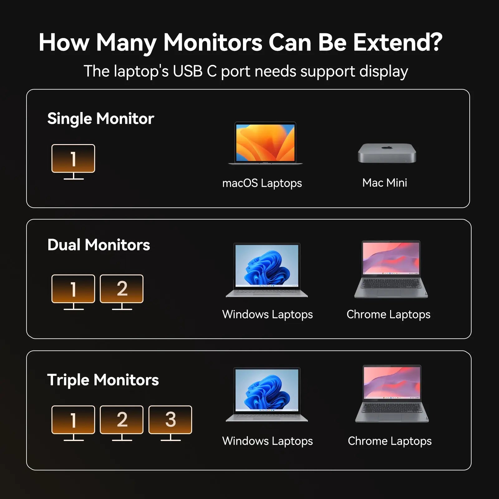 Before purchase, please make sure your laptop's USB-C port supports Power Delivery, DisplayPort, and Data transfer, you can easily find port details specifications on the laptop's user manual, or consult the seller with your exact laptop model.