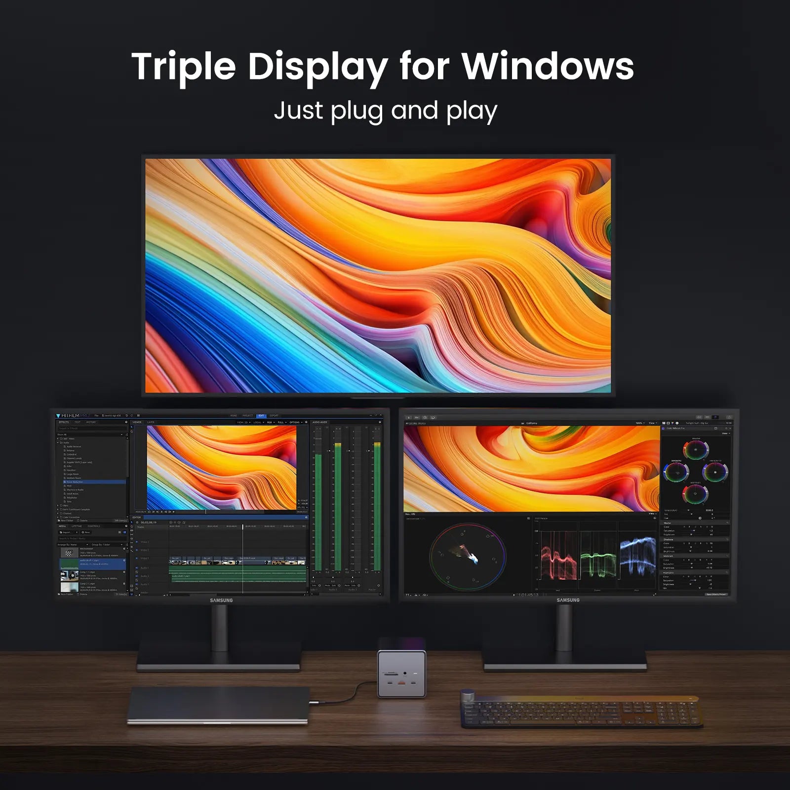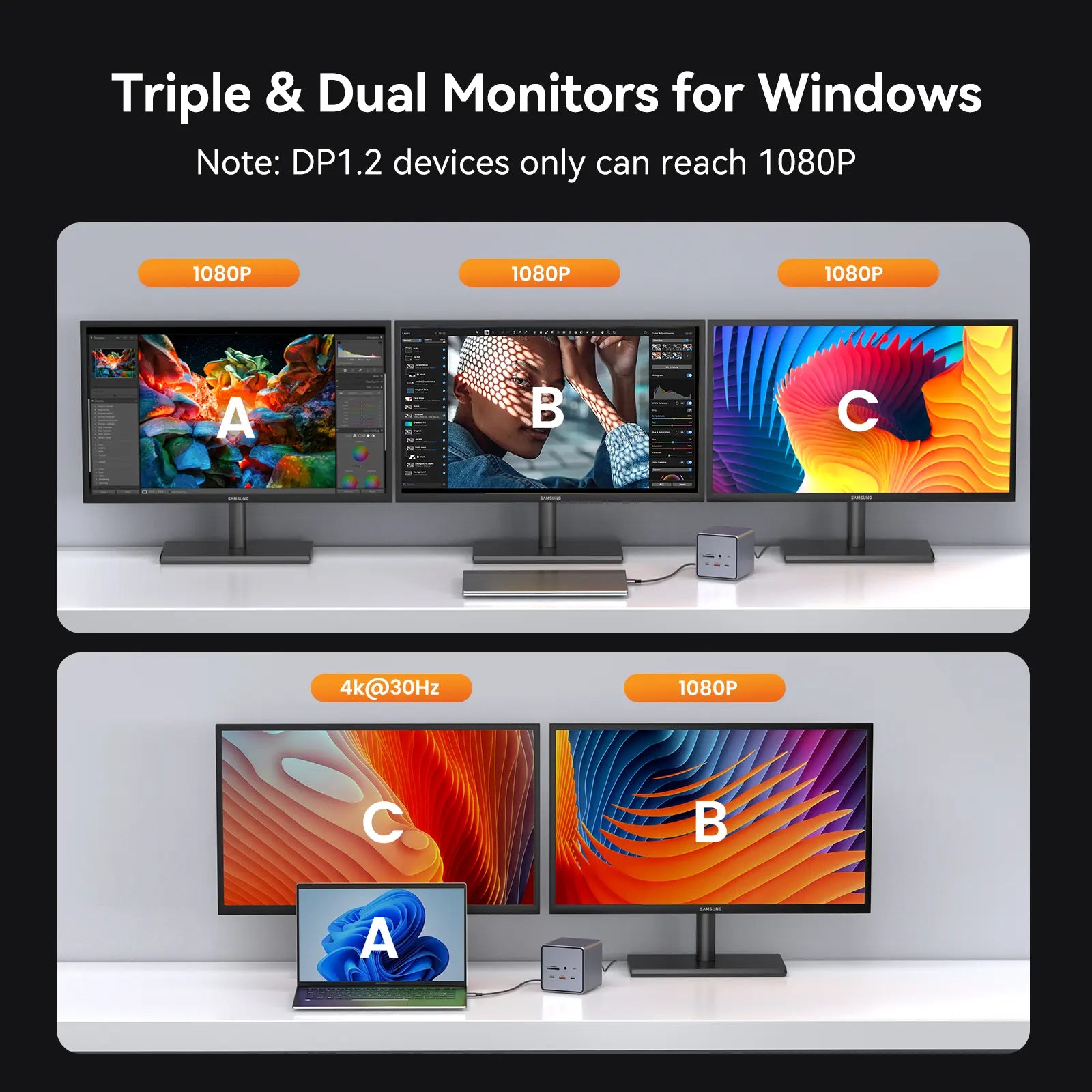 Extend Dual Monitor Docking Station: You can use the USB C docking station to extend your full-feature USB C Windows laptop to multiple screens using any combination of HDMI 1, HDMI 2, and DisplayPort. When you extend a single monitor, the resolution can be up to 4K@60Hz (DP1.4 source). Extending 2 monitors, the first detected monitor resolution can be up to 4K@30Hz and the other only 1080P. You can enjoy more precise and vivid details in graphic-intensive CAD drawings and Photoshop images.
