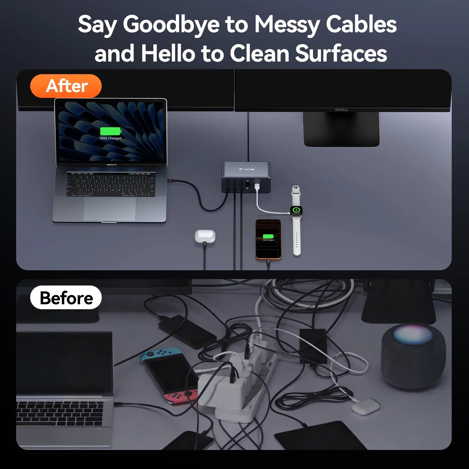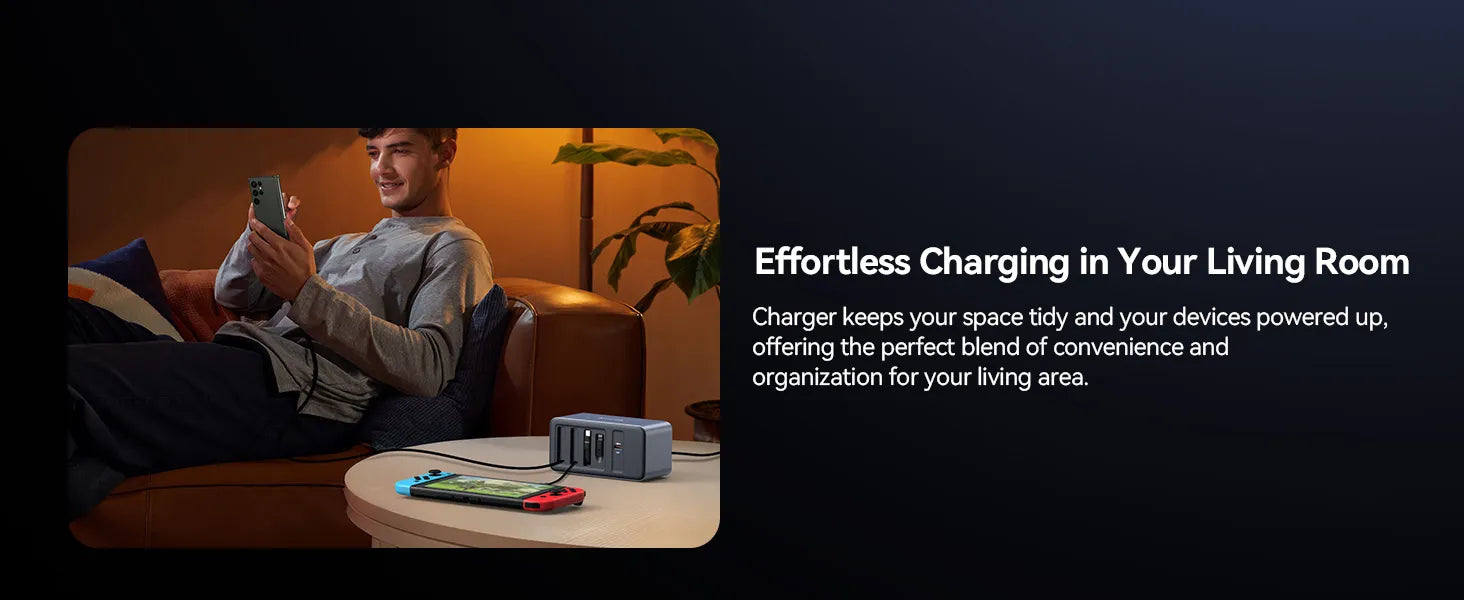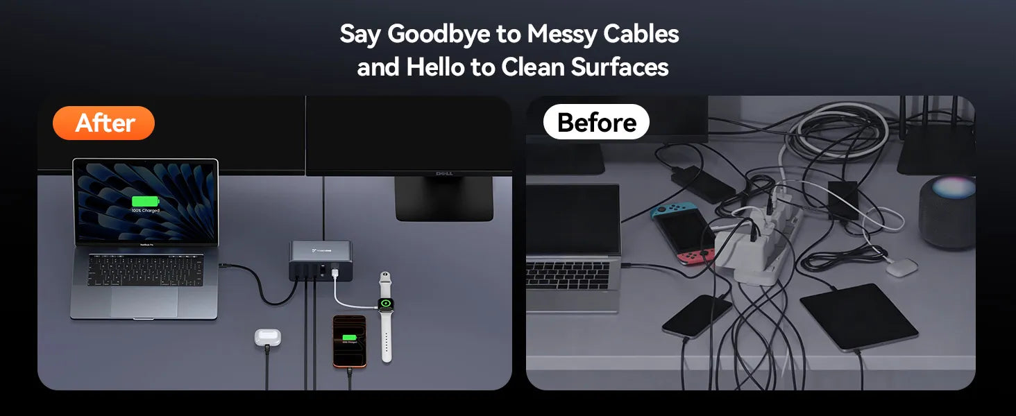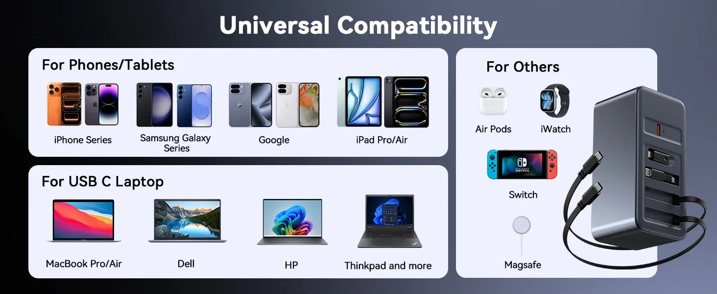• Wide Compatibility: This USB-C charging station powers both USB C and USB A devices. Compatible with MacBook Pro/Air, Dell XPS, HP, iPad Pro/Air/Mini, ThinkPad, iPhone series, Samsung S24/S23, Google, AirPods, Switch, and more
