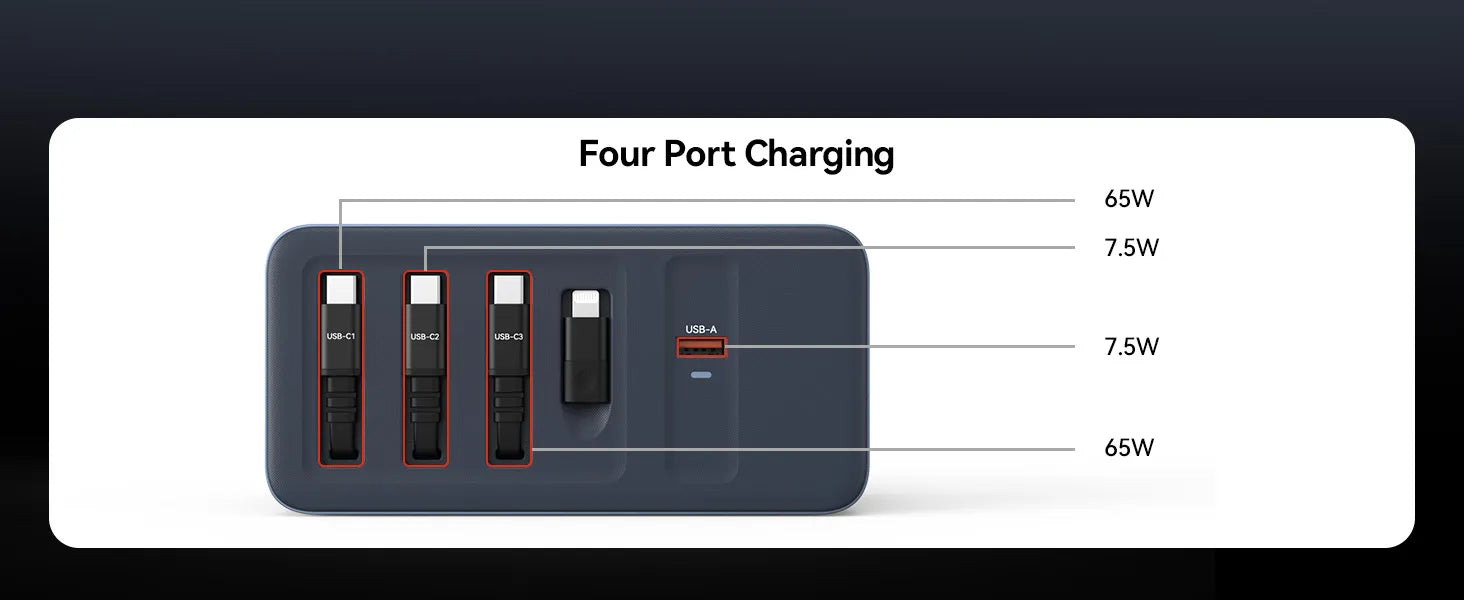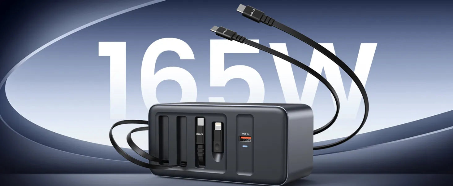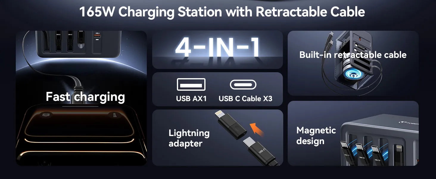 165W USB C Charging Station with Built-in Retractable Cable(2.3ft) & Lightning Adapter