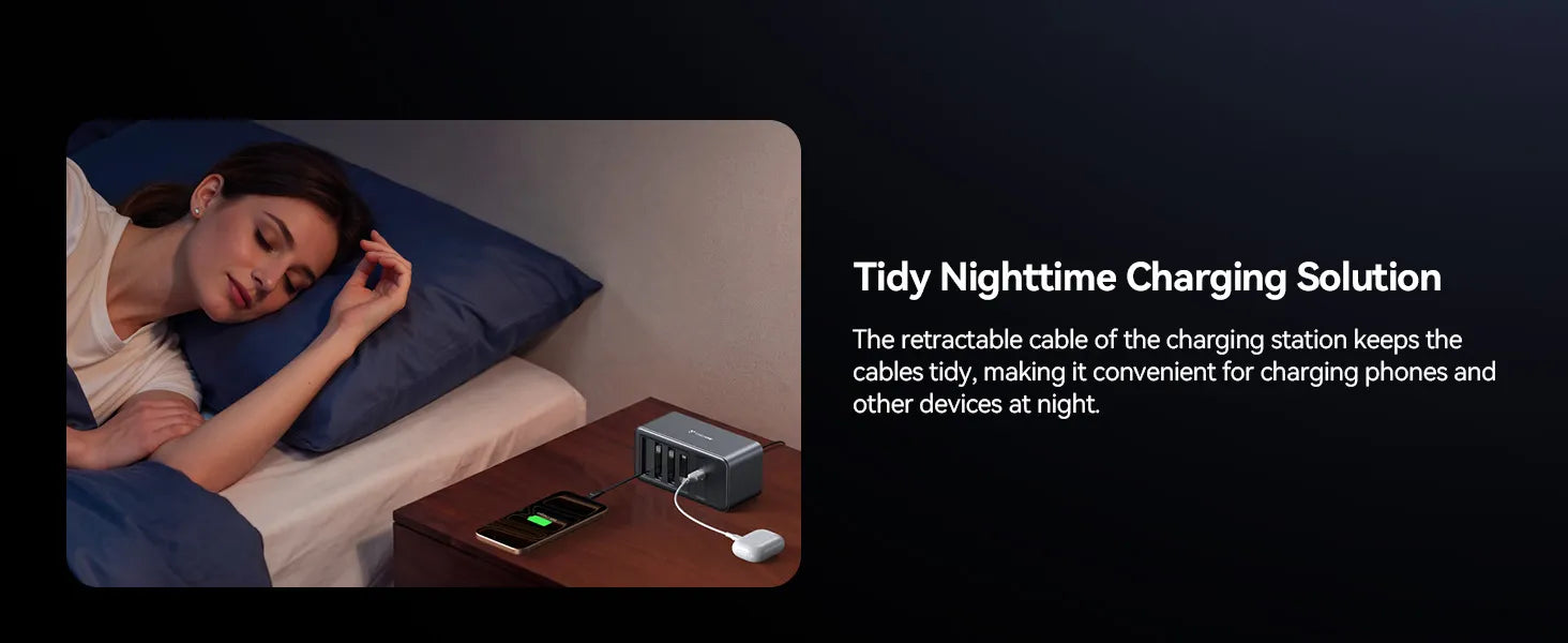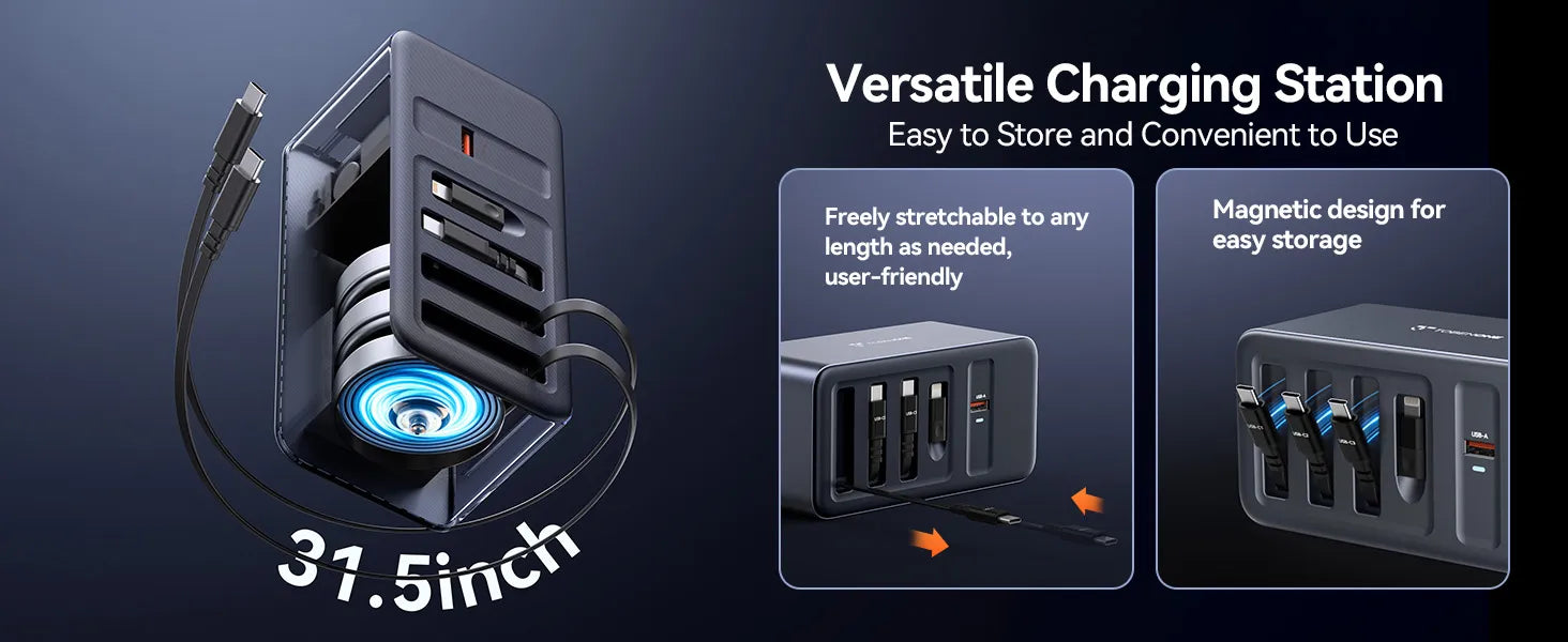 • Tangle-Free Workspace & Instant Organization: Our charging station features three retractable USB-C cables that extend up to 31.5 inches. This pull-and-release design allows you to use only the length you need, keeping your home office, nightstand, or executive desk perfectly neat. When finished, the cables retract instantly, eliminating messy wires and reclaiming your workspace for maximum productivity