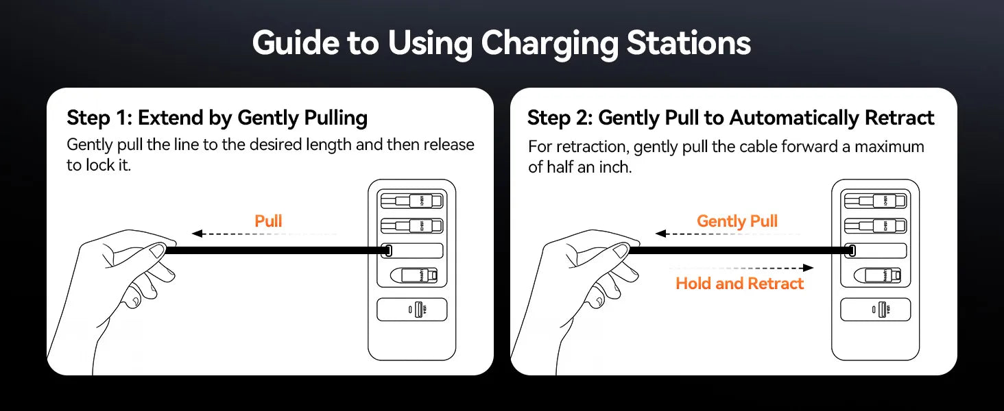 The built-in cord of this multiple charging station has a locking mechanism. To retract the retractable cord, gently pull the cable about 0.05ft (1.5cm) and it will automatically retract.