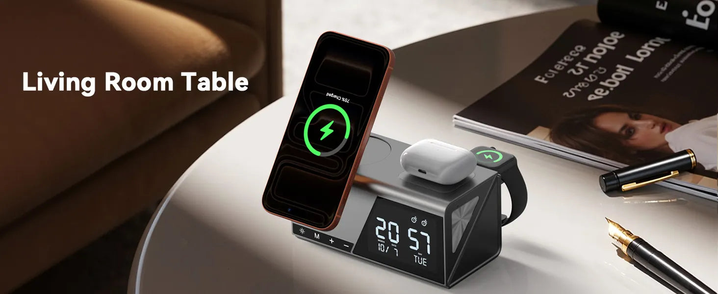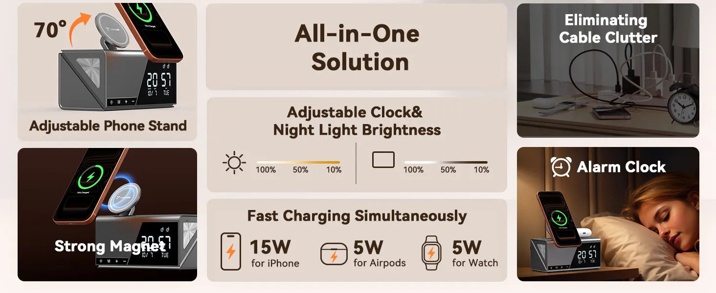 • Streamline Your Charging with Speed: The strong MagSafe magnetic feature not only enables fast and precise alignment for charging but also secures the device (the phone supports horizontal or vertical placement). Charging station with clock can simultaneously deliver 15W of power for charging your phone, 5W for your Apple Watch, and 2.5W for your AirPods. Free yourself from cable constraints, providing you with a tidy and convenient charging environment.