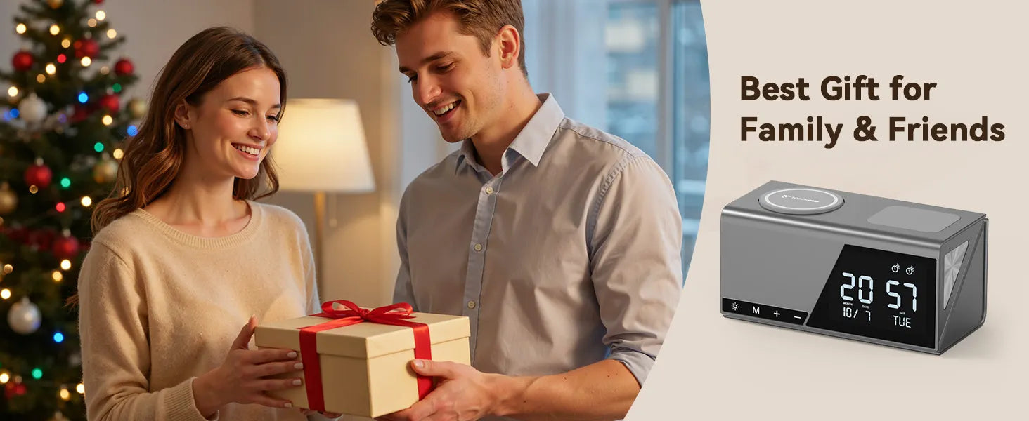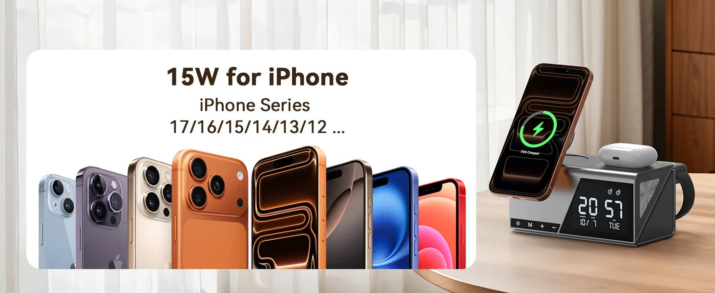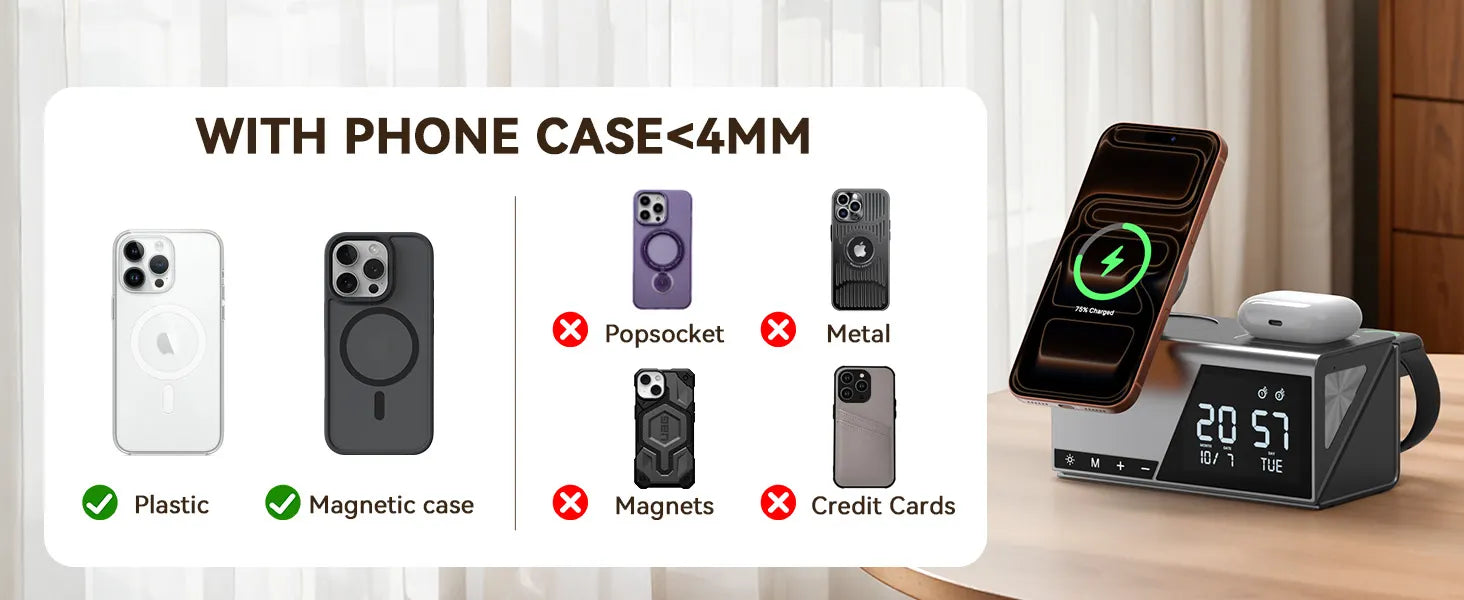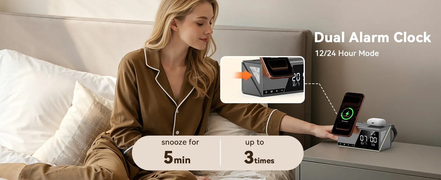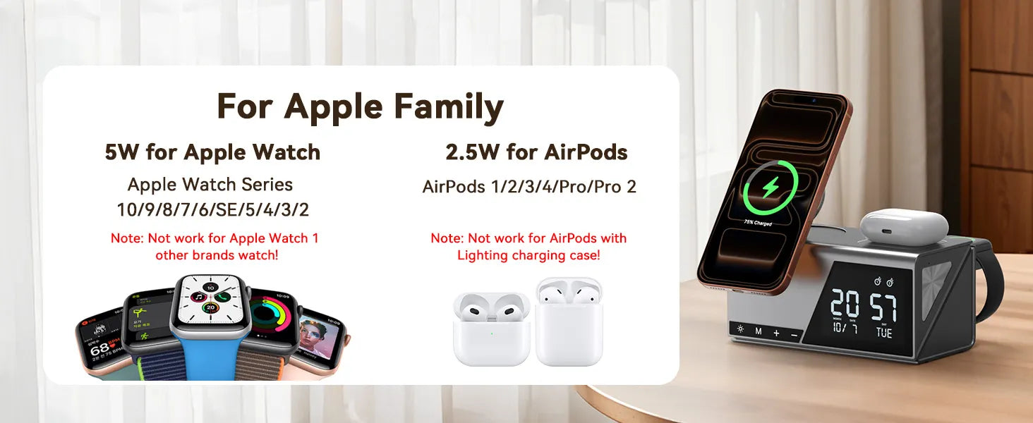 • Wide Compatibility with Multiple Devices: The alarm clock with charging station is compatible with wireless function devices, such as iPhone 16/15/14/13/12 series, Samsung Galaxy S23/S22/S21/S20/Note20/Note10, Apple Watch Series 2 - 10, AirPods2/AirPods Pro/AirPods3.